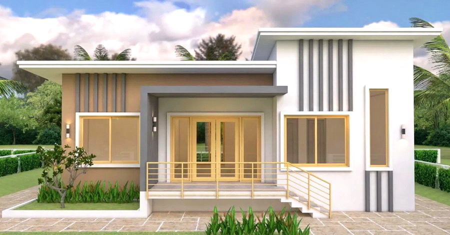 สำหรับแบบบ้านหลังนี้เป็นแบบบ้านขนาดชั้นเดียว ฐานของบ้านถูกยกขึ้นสูง ตัวบ้านมีดีไซน์ในทรงสี่เหลี่ยมหน้ากว้าง หลังคาเป็นแบบเรียบผสานไปกับทรงเพิงหมาแหงน ผนังภายนอกตกแต่งด้วยโทนสีขาว สลับกับน้ำตาล และสีเทา