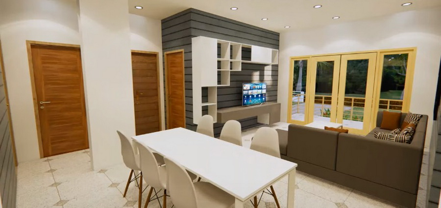 เมื่อเข้ามาภายในบ้าน เราจะพบกับห้องโถงนั่งเล่นขนาดใหญ่ ซึ่งภายนอกแบ่งพื้นที่ใช้สอยเป็นห้องนั่งเล่นและพื้นที่ห้องรับประทานอาหารอย่างเป็นสัดส่วน