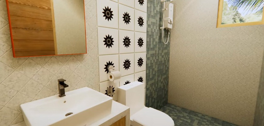 ทางด้านห้องน้ำ เป็นห้องที่มีขนาดพอเหมาะ ภายในตกแต่งด้วยแผ่นกระเบื้องที่หลากหลาย พร้อมกับติดตั้งสิ่งอำนวยความสะดวกที่เพียงพอต่อการใช้งาน