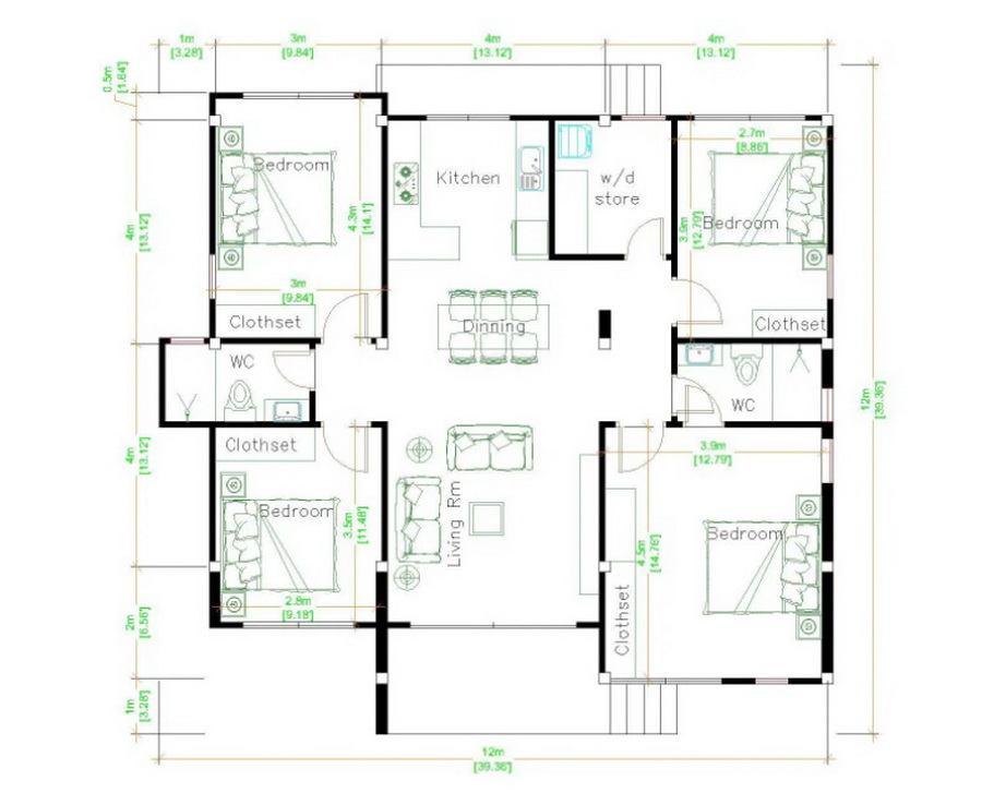แบบบ้านสไตล์โมเดิร์นหลังนี้ประกอบไปด้วย 4 ห้องนอน 2 ห้องน้ำ 1 ห้องโถงนั่งเล่น 1 ห้องครัว 1 ห้องซักล้าง พื้นที่ใช้สอยทั้งหมดประมาณ 144 ตารางเมตร