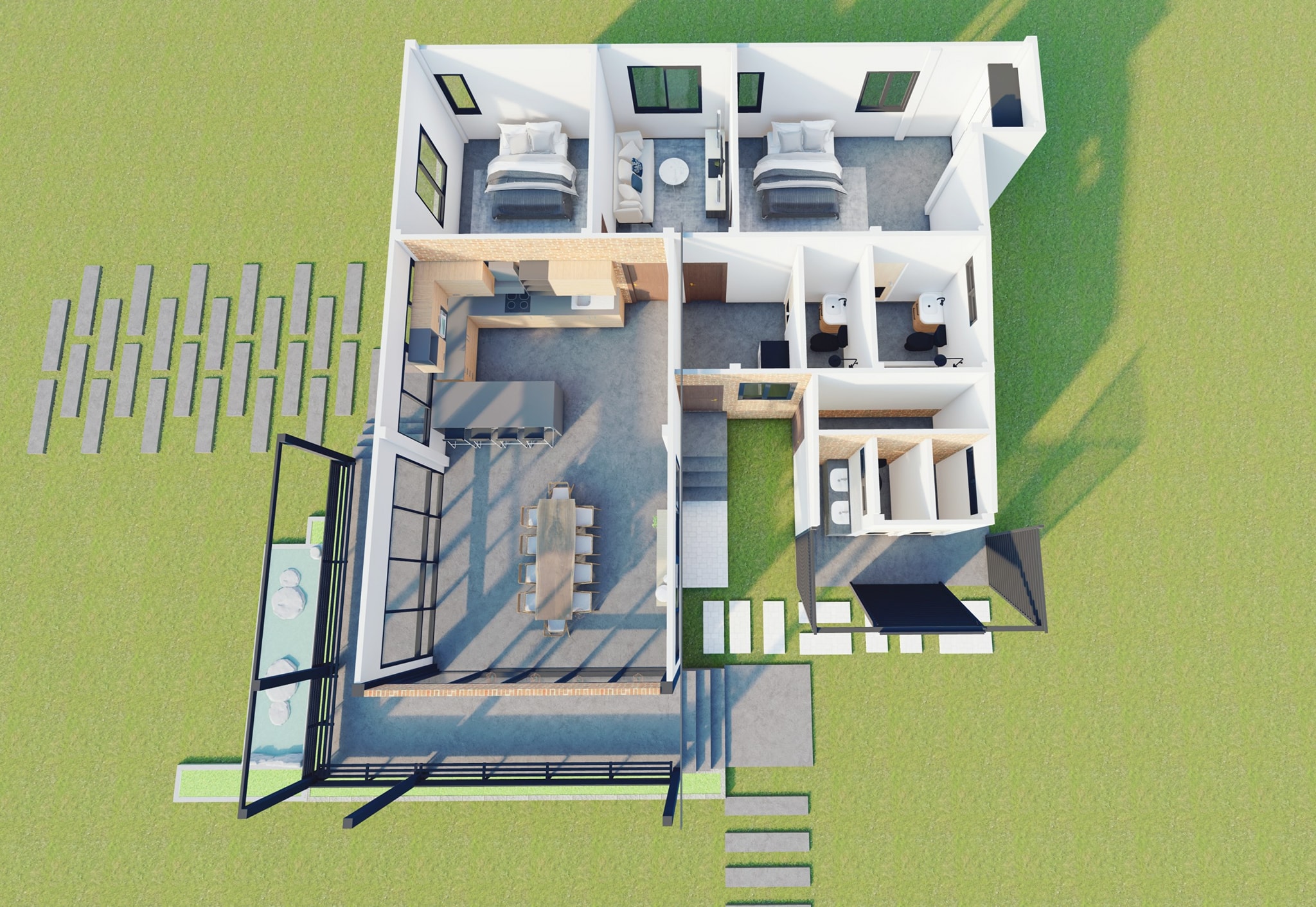 แบบร้านกาแฟพร้อมที่พักอาศัยหลังนี้ประกอบไปด้วย 2 ห้องนอน 4 ห้องน้ำ 1 ห้องโถงใหญ่ 1 ห้องครัว พื้นที่ใช้สอยทั้งหมดประมาณ 145 ตารางเมตร