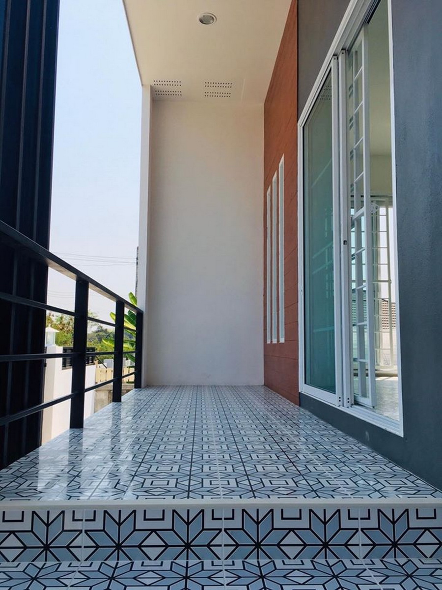 บริเวณทางเข้าหน้าบ้านเป้นทางเดินระเบียงขนาดเล็กที่ตกแต่งพื้นด้วยกระเบื้องเล่นลวดลายสวยงาม ซึ่งช่วยให้บ้านโดดเด่น ตัดกับการตกแต่งแนวโมเดิร์นที่เรียบง่ายในส่วนอื่นของบ้าน