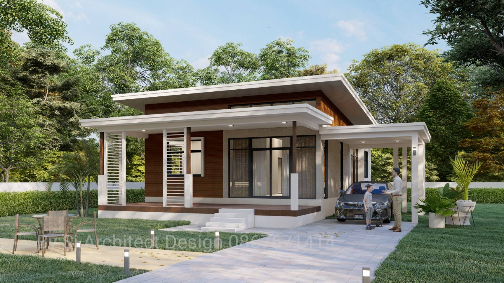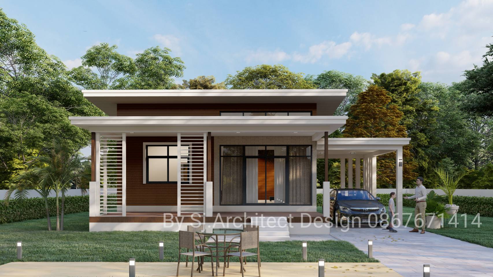 แบบบ้านหลังนี้เป็นบ้านชั้นเดียว ตัวบ้านมีรูปทรงสี่เหลี่ยมตามแบบฉบับบ้านสไตล์โมเดิร์น งานหลังคาออกแบบด้วยทรงสโลป ผสานกับหลังคากันสาดที่ช่วยป้องกันแสงแดดและฝนที่อาจสาดกระเส็นใส่พื้นที่ภายในบ้าน ด้านการตกแต่งนั้น ตัวบ้านเลือกใช้โทนสีขาวคีมสลับกับโทนสีน้ำตาลที่เข้ากันอย่างลงตัว