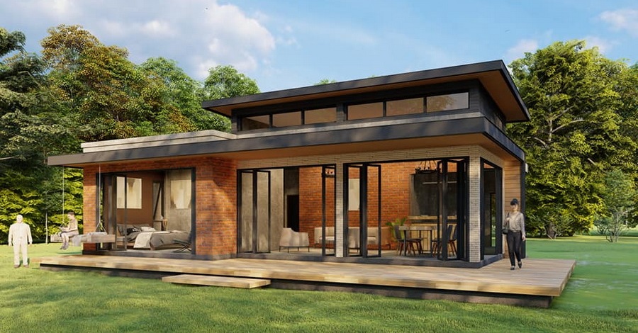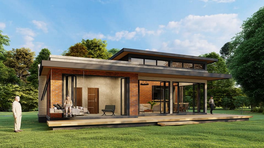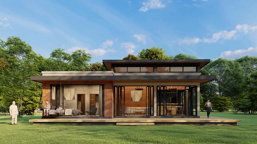 แบบบ้านหลังนี้เป็นบ้านขนาดชั้นเดียว ตัวบ้านมีพื้นฐานการดีไซน์ในแบบบ้านโมเดิร์นทั่วไปในแบบหน้ากว้าง มีหลังคาทรงเพิงหมาแหงนผสานกับแบบเรียบ ด้านการตกแต่งนั้น ผนังภายนอกเลือกใช้ผนังอิฐโชว์แนวที่ให้ความดิบเท่ในแบบอินดัสเทรียลได้อย่างชัดเจน