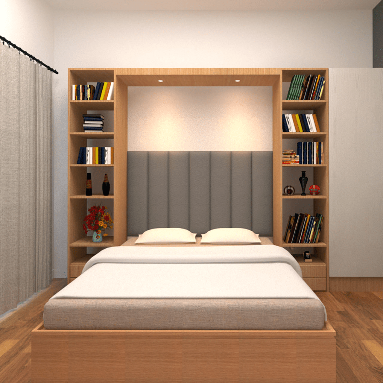 การตกแต่งหัวเตียงสไตล์นี้จะเป็นการติดตั้งชั้นวางหนังสือ ซึ่งจะเต็มไปด้วยหนังสือ พร้อมแสงไฟแบบพอเหมาะให้เราสามารถเพลิดเพลินไปกับหนังสือเล่มโปรดได้