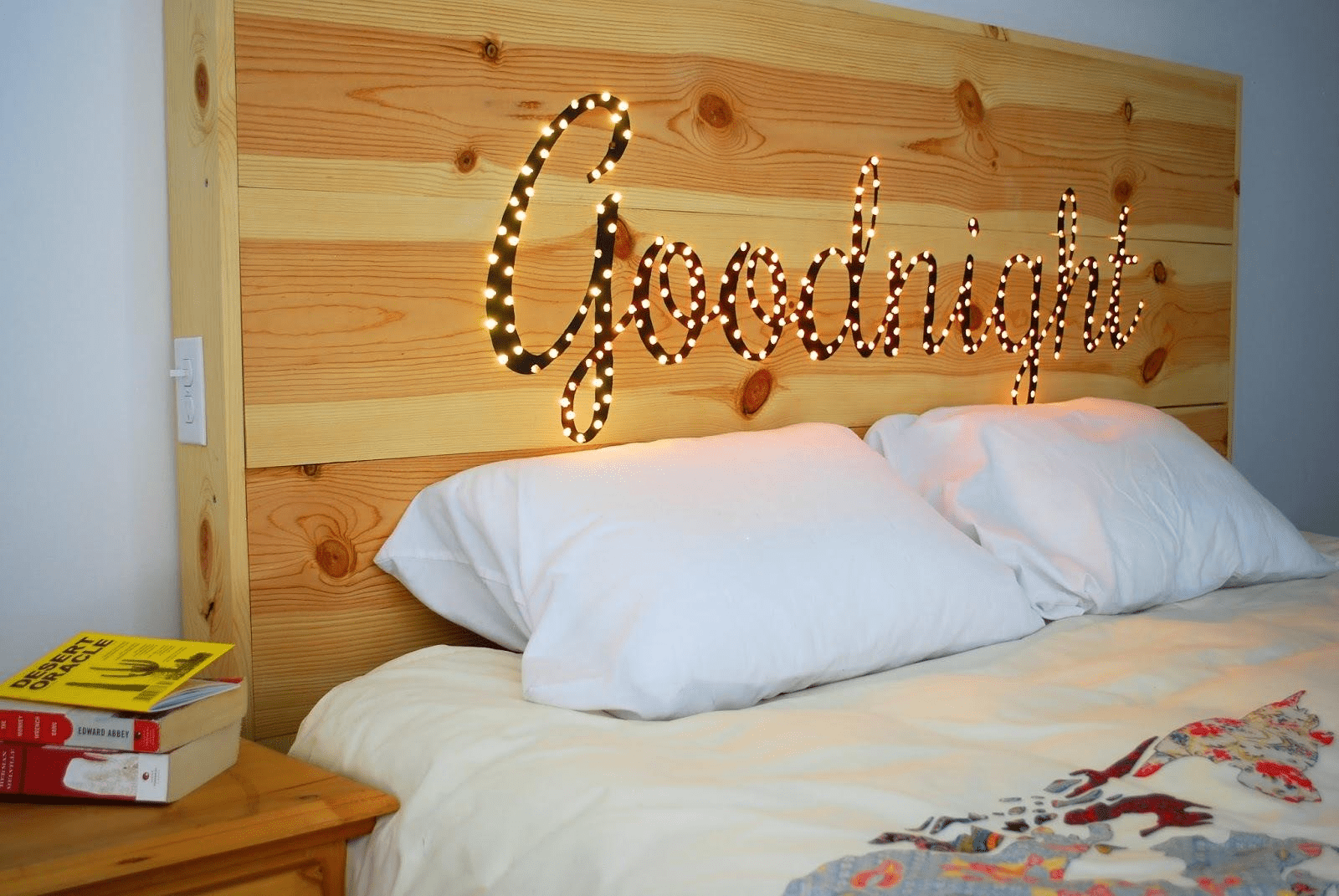 การตกแต่งหัวเตียงแบบนี้ เราจะออกแบบหัวเตียงด้วยข้อความต่าง ๆ จากนั้นจึงติดตั้งไฟสายเอาไว้ จึงให้แสงสว่างและความสวยงามไม่น้อยเลย
