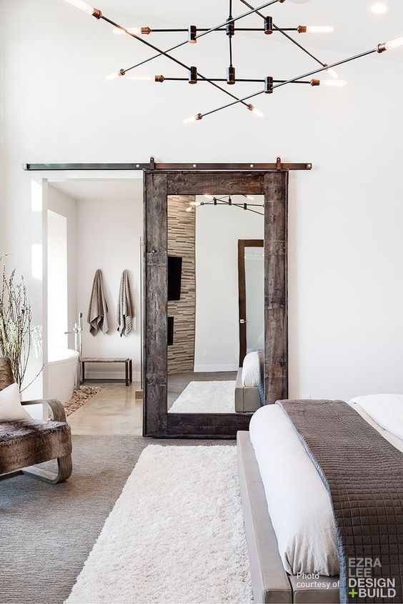ประตูบานแขวนสำหรับแบ่งห้องน้ำออกจากห้องนอนนั้นจะทำให้พื้นที่อยู่อาศัยดูหรูหรามากยิ่งขึ้น สามารถเลือกใช้ประตูที่เป็นไม้ หรือแบบขุ่น/กึ่งโปร่งแสง ก็เหมาะดีครับ