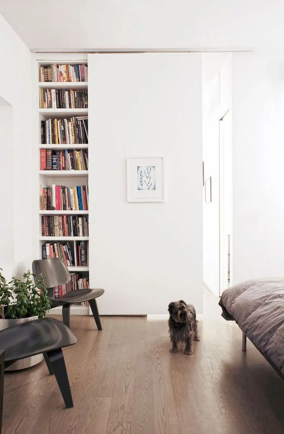 สำหรับห้องนอนที่มีขนาดเล็กหรือห้องสตูดิโอ การเลือกใช้ประตูบานแขวนนั้นเป็นทางเลือกที่น่าสนใจ เพราะจะช่วยให้เราสามารถมีพื้นทีเก็บของบริเวณผนังฝั่งประตูได้มากขึ้นนั่นเอง