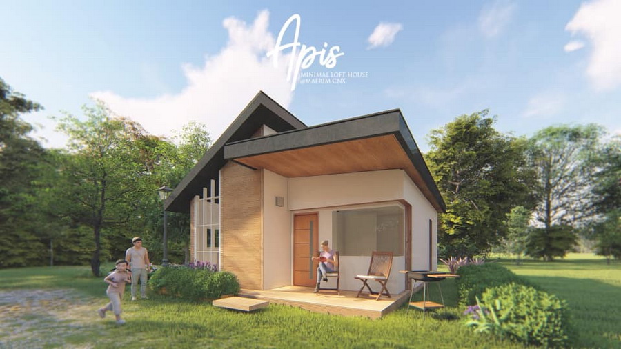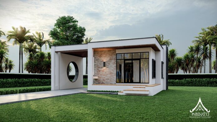 5. แบบบ้านชั้นเดียวแนวมินิมอล ดีไซน์อบอุ่นกะทัดรัด มีผนังช่องลมหน้าบ้าน 2 ห้องนอน 2 ห้องน้ำ พื้นที่ 94 ตร.ม.