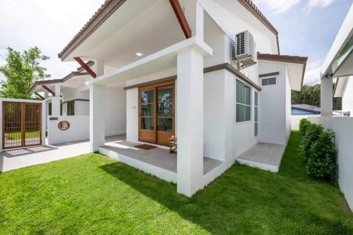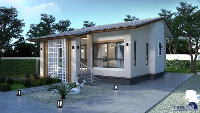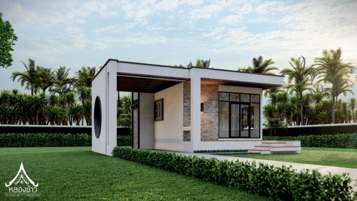 4. แบบบ้านชั้นเดียวสไตล์โมเดิร์นมินิมอล หลังเล็กกะทัดรัด 60 ตร.ม. มีระเบียงหน้าบ้านรับธรรมชาติและอากาศสดใส