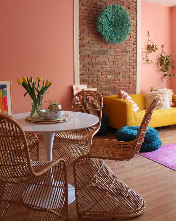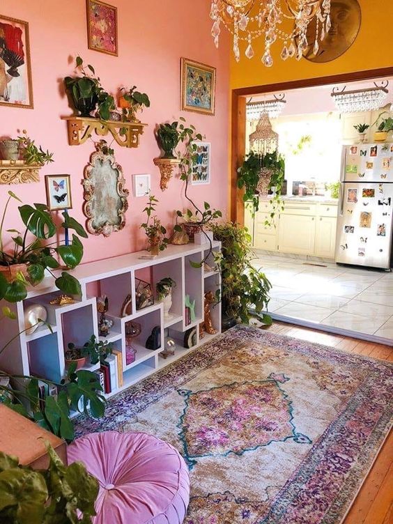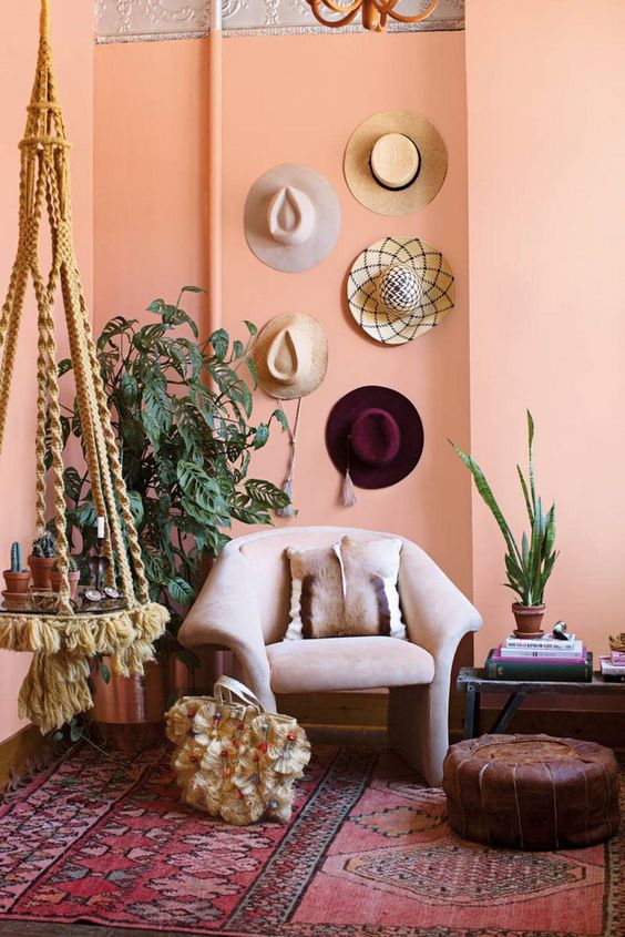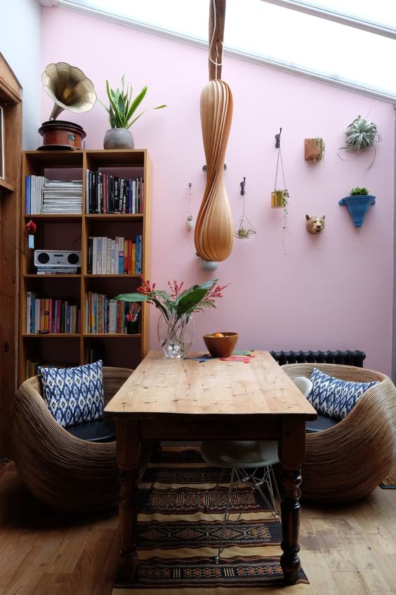 2. ผนังห้องสีชมพูพร้อมกับการตกแต่งในสไตล์โบฮีเมียน