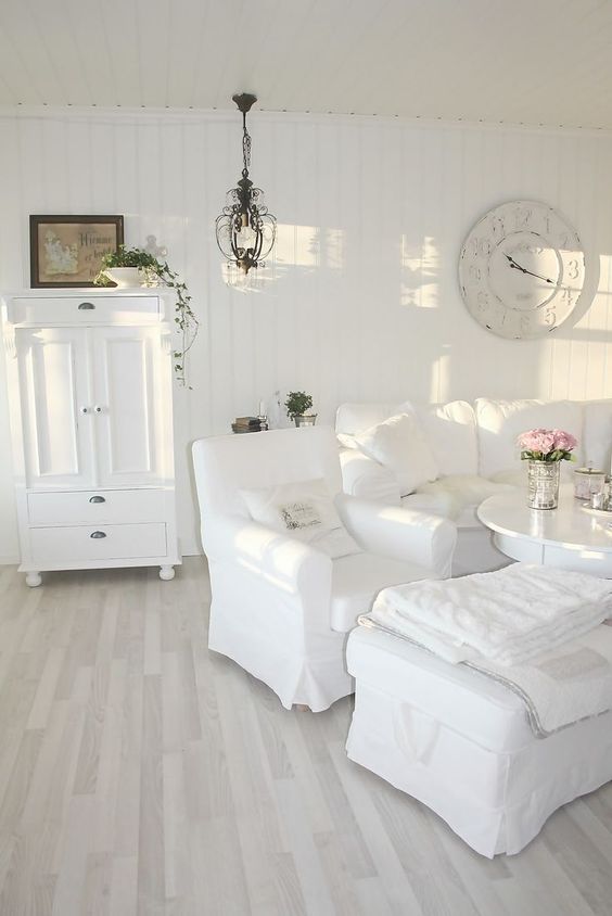 1. ภายในห้องนั่งเล่นที่ตกแต่งด้วยโทนสีขาวในเฉดเดียวกันทั้งหมด ให้ความกลมกลืนกัน