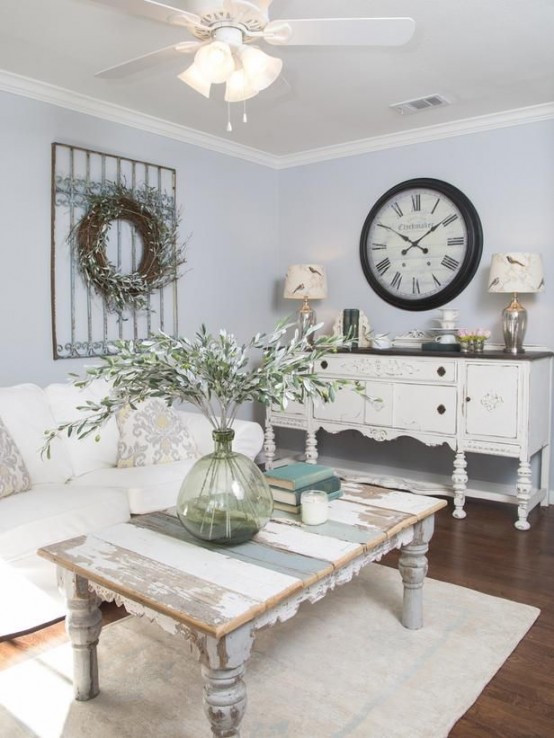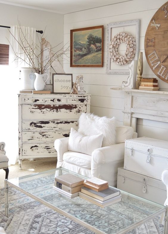 14. โต๊ะไม้จากกล่องและเตาผิงแบบรัสติกตัดกับโทนสีขาวได้อย่างลงตัว