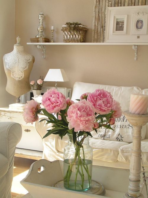 12. ดอกไม้สีชมพูสดที่ตั้งเด่นอยู่ในห้องสีขาวครีม