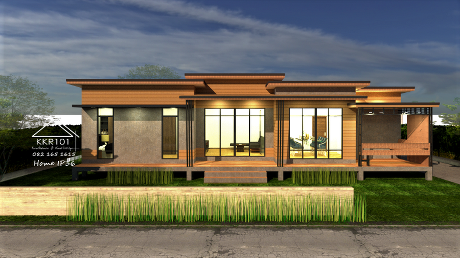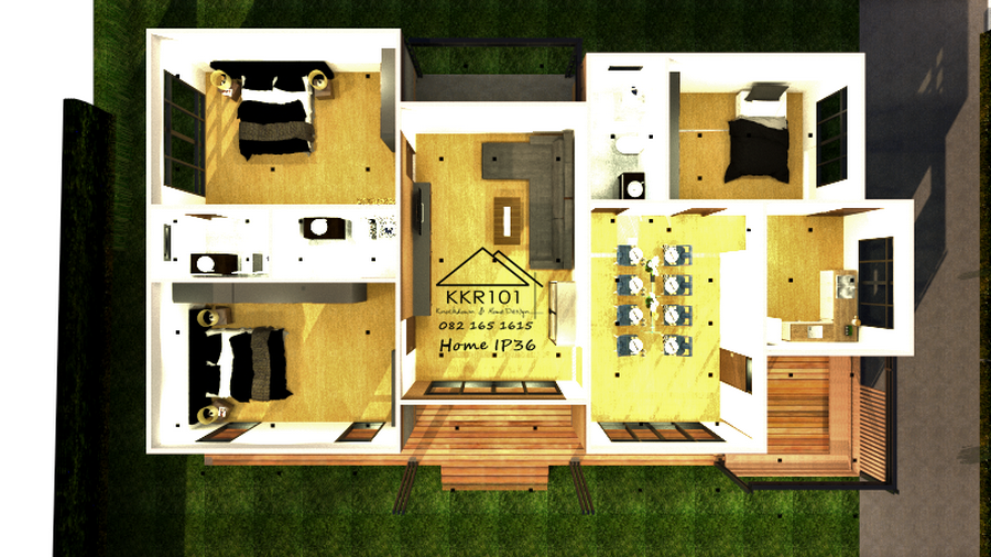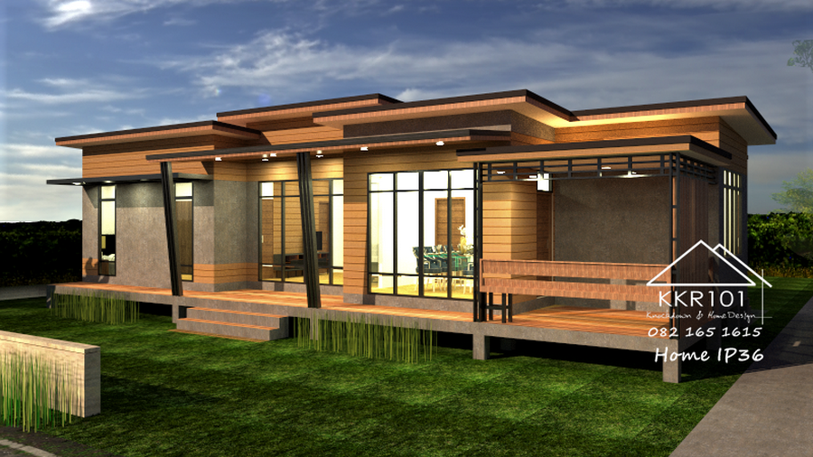 แบบบ้านน็อคดาวน์สไตล์โมเดิร์น ดีไซน์หน้ากว้างและยกพื้นสูง 3 ห้องนอน 3 ห้องน้ำ พื้นที่ 150 ตร.ม.