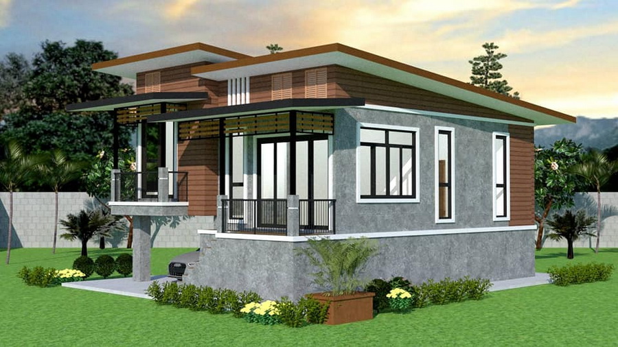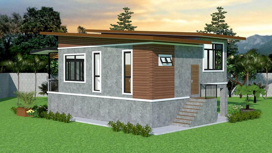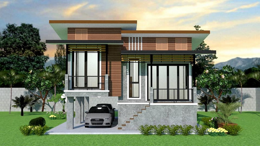 แบบบ้านหลังนี้เป็นบ้านขนาดชั้นครึ่ง ตัวบ้านมีพื้นฐานการออกแบบตามดีไซน์ของบ้านทรงโมเดิร์น จึงทำให้บ้านมีรูปลักษณ์สี่เหลี่ยมแบบเรขาคณิต ตัวหลังคามีลักษณะเป็นทรงเพิงหมาแหงน ด้านการตกแต่งนั้น ผนังภายนอกตกแต่งด้วยผนังปูนเปลือยแบบสวยดิบ ตัดกับผนังโทนสีน้ำตาลและดำ