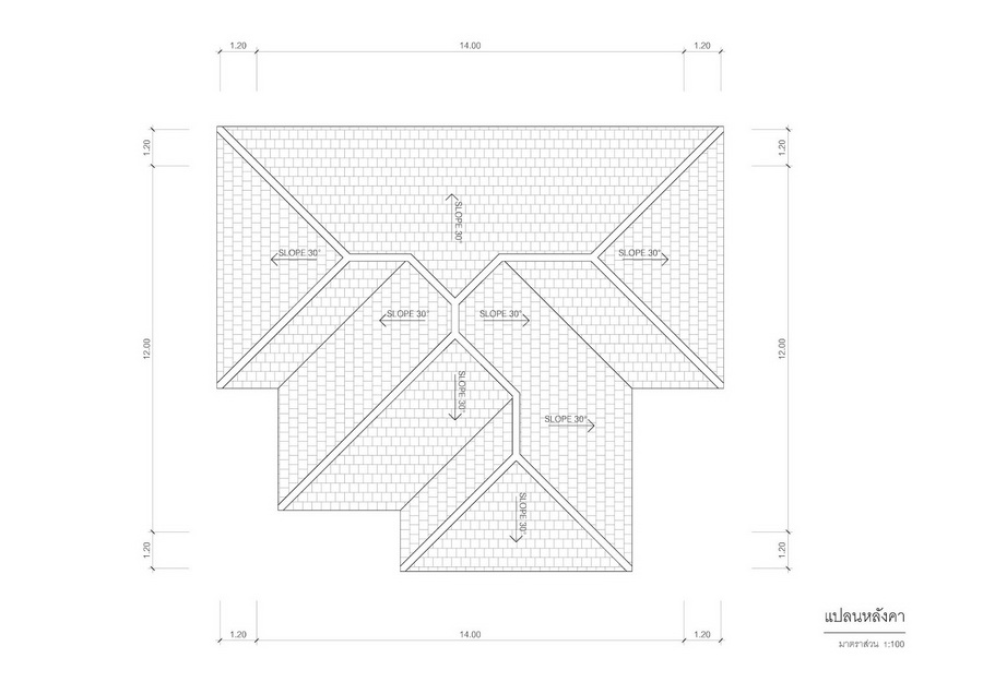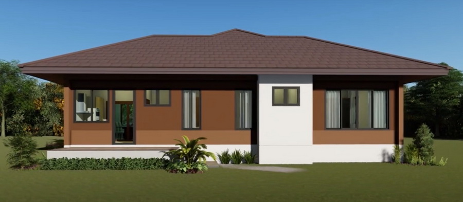 สำหรับดีไซน์ของบ้านหลังนี้ก็เป็นทรงแบบร่วมสมัยที่เราต่างคุ้นเคยกันดี ตัวบ้านมีขนาดชั้นเดียว ตกแต่งในโทนสีที่ให้บรรยากาศอบอุ่น ความโดดเด่นของบ้านจะอยู่ที่หลังคาทรงปั้นหยาที่ออกแบบเล่นระดับ พร้อมกับมุงด้วยกระเบื้องแบบเรียบ จึงให้ความสวยงามดึงดูดสายตา