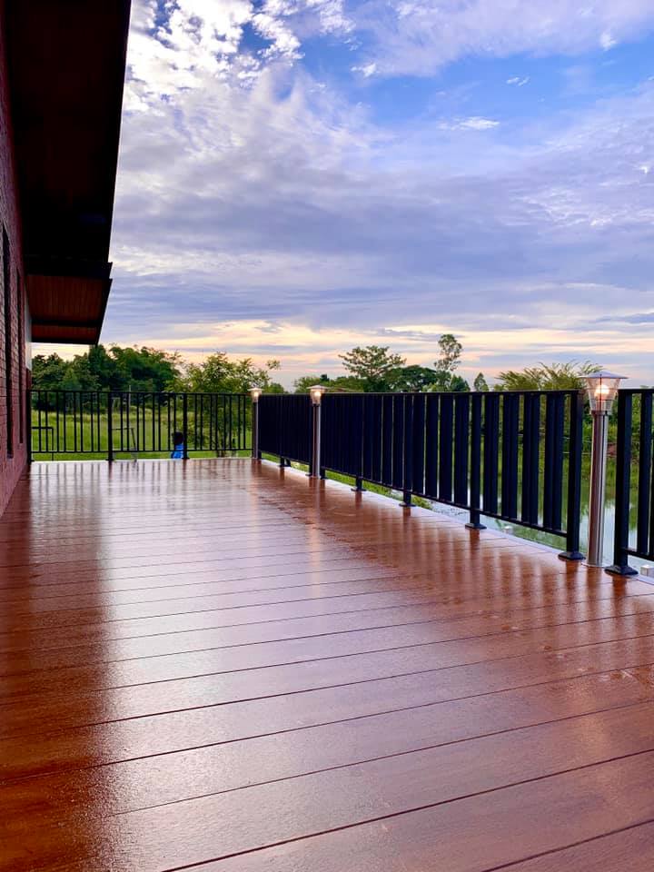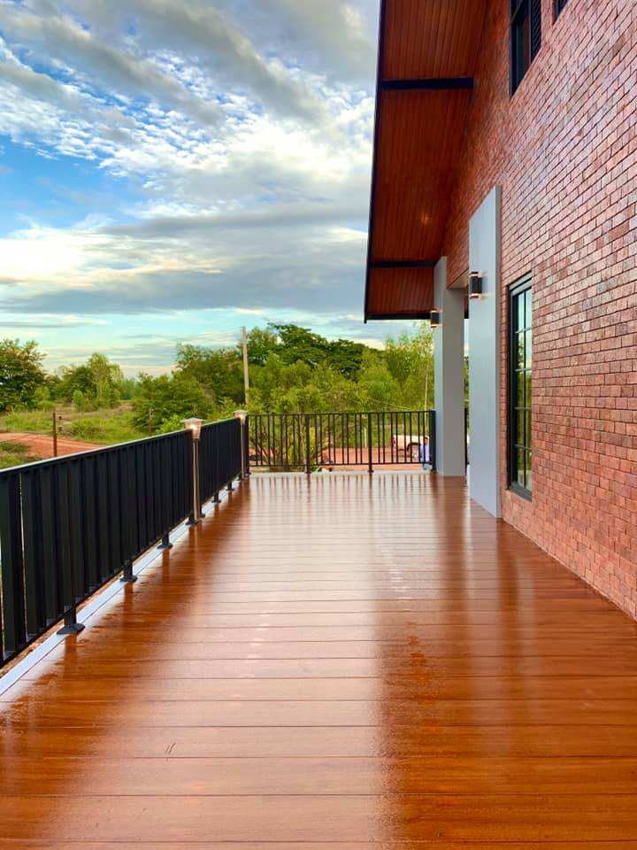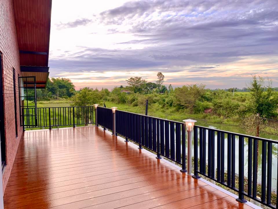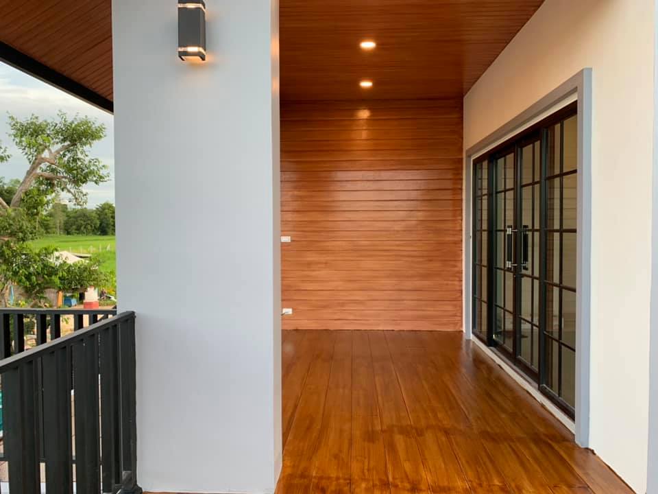 ถัดจากผนังอิฐโชว์แนวก็จะเป็นเฉลียงของบ้านที่มีพื้นที่กว้างขวางสุด ๆ โดยจะหันหน้าไปสู่ทุ่งนาที่กว้างสุดลูกหูลูกตา ทำให้เป็นพื้นที่เพื่อการพักผ่อนอย่างแท้จริง