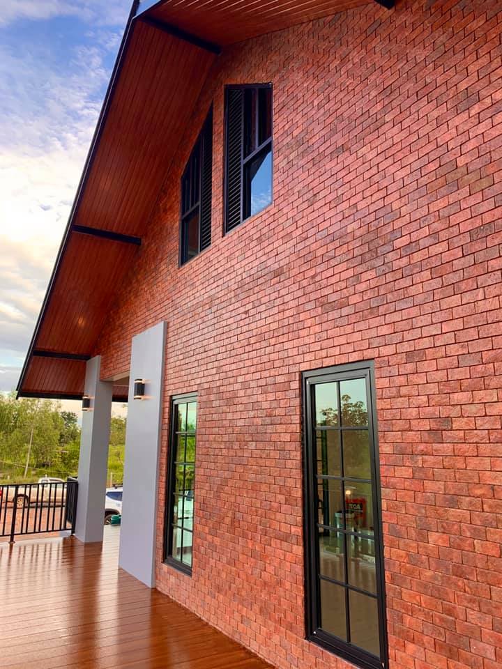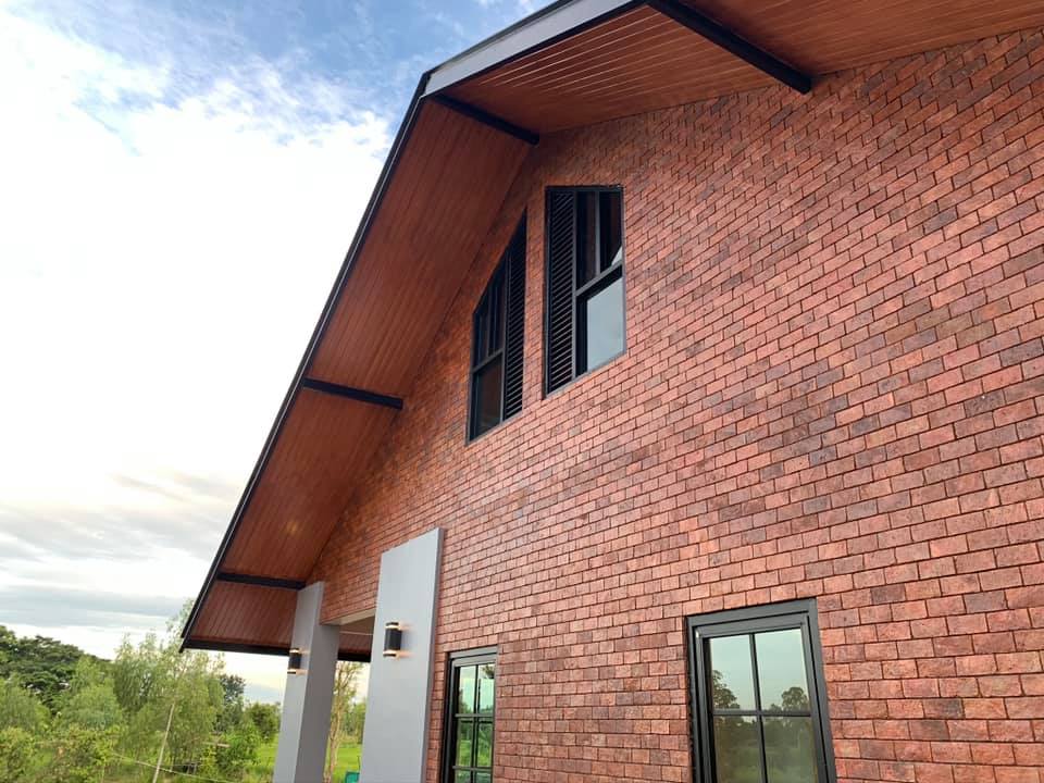 จุดที่เป็นความโดดเด่นของบ้านหลังนี้ คือ บริเวณผนังแห่งนี้ที่ตกแต่งด้วยอิฐมอญจนได้ผนังอิฐโชว์แนวที่ให้บรรยากาศของบ้านแนวคันทรีได้อย่างลงตัว