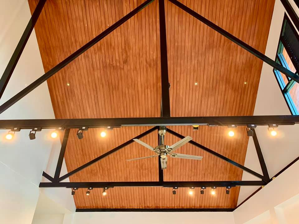 เมื่อเข้ามาภายในบ้านก็จะพบกับห้องโถงหลักของบ้านที่ออกแบบเพดานยกสูงแบบโรงนา พร้อมกับมีโครงเหล็กเป็นคานที่ประดับไปด้วยหลอดไฟให้แสงสว่างภายในบริเวณห้อง