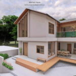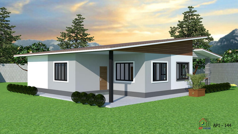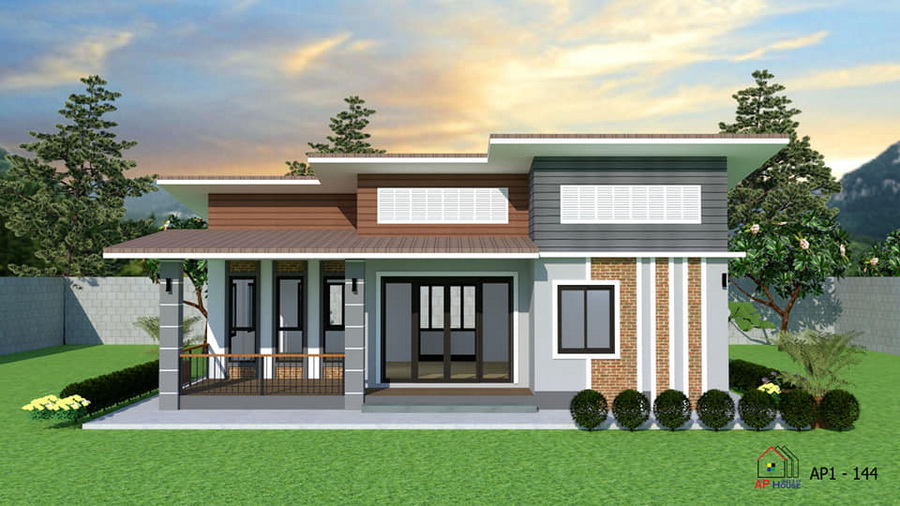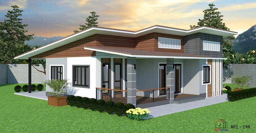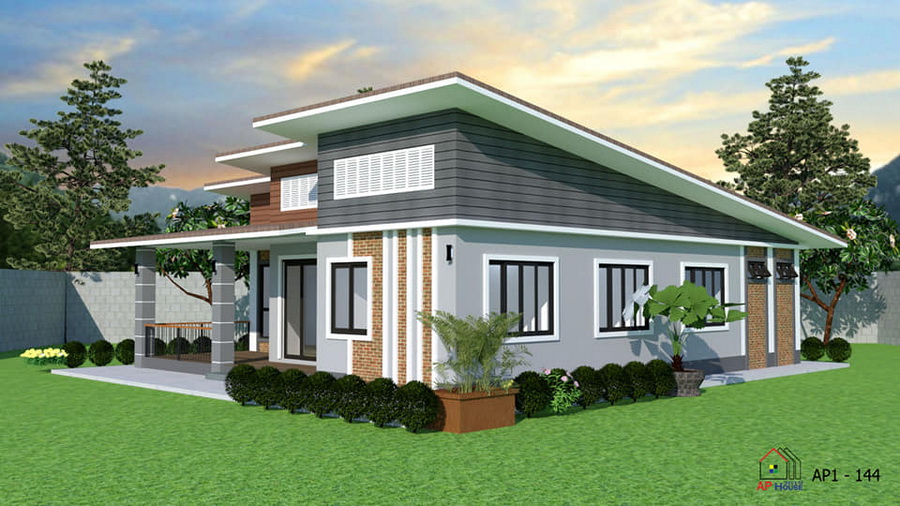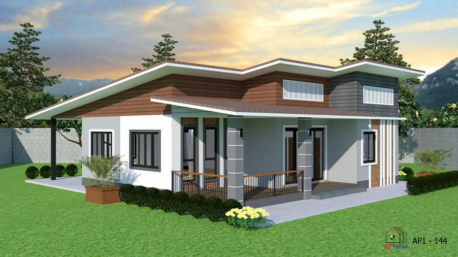 แบบบ้านหลังนี้เป็นบ้านชั้นเดียวที่ออกแบบหน้ากว้าง ตัวบ้านมีดีไซน์แบบสี่เหลี่ยมเรขาคณิต มาพร้อมการออกแบบหลังคาแบบลาดเอียงที่เข้ากันได้ดีกับตัวบ้าน ด้านการตกแต่งนั้น ผนังภายนอกเลือกใช้โทนสีขาวครีมเป็นหลัก แซมด้วยสีน้ำตาลและสีน้ำ ทำให้บ้านดูมีมิติมากยิ่งขึ้น
