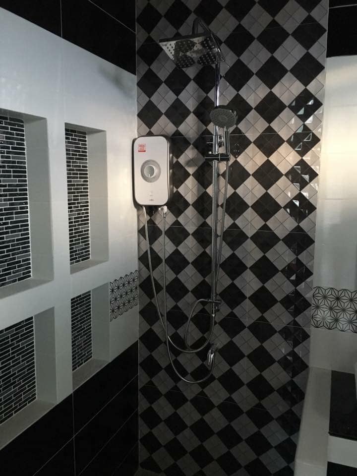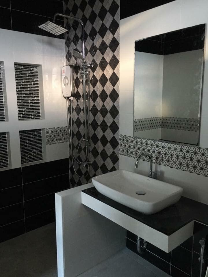 ห้องนอนจัดว่ามีความเรียบหรู สังเกตได้จากการเลือกใช้วัสดุผนังห้องที่เป็นกระเบื้องลายหินอ่อนสีขาว ที่ตัดกับกระเบื้องโมเสคสีดำได้เป็นอย่างดี ส่วนพื้นห้องที่เป็นสีเทาก็ช่วยให้ดูสะอาดตา และไม่สกปรกง่ายค่ะ