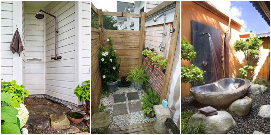 เลือกตามมุมบ้าน หรือริมผนังบ้าน สร้างเป็นมุมอาบน้ำกลางแจ้ง เหมาะสำหรับบ้านสวน บ้านตากอากาศมากกว่าบ้านในเมือง แนะนำให้ตกแต่งด้วยต้นไม้ รวมทั้งกำแพง เพื่อการปกปิดในบางส่วน เพื่อความเป็นส่วนตัว
