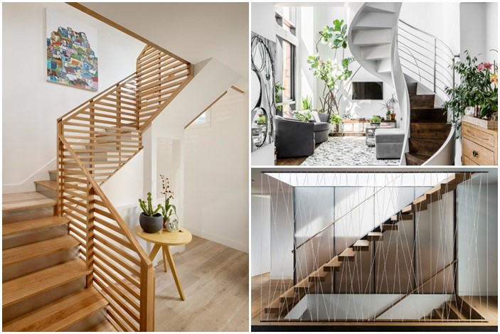 ใช้บันไดจากวัสดุไม้ บนโครงเหล็กหรือคอนกรีต ยืดติดกับผนัง ดีไซน์ให้เรียบง่าย ตกแต่งเพิ่มเติมให้โปร่งใส จากกระจก เน้นความโมเดิร์นแต่ไม่ลืมวัสดุจากธรรมชาติ ได้ผิดสัมผัสที่ขรุขระ เข้าถึงธรรมชาติได้ดีกว่าโลหะ