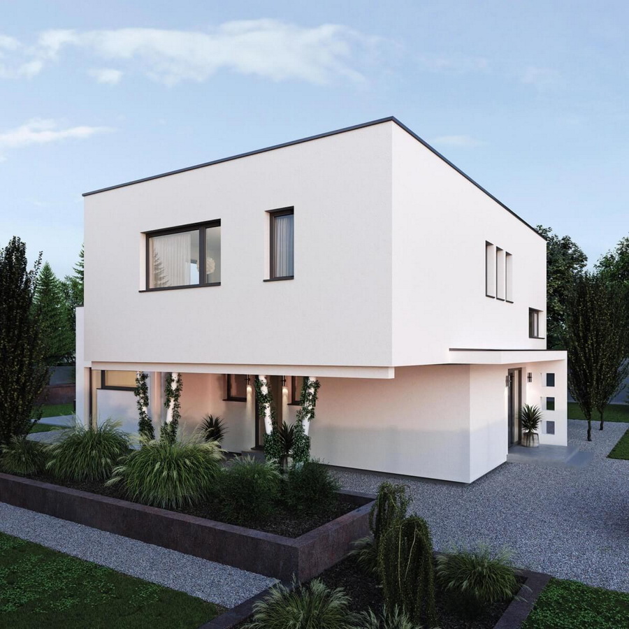 แบบบ้านหลังนี้เป็นแบบบ้านขนาดสองชั้น ตัวบ้านเป็นบ้านสไตล์โมเดิร์นในทรงกล่อง ผนังภายนอกตกแต่งในโทนสีขาวแบบเรียบง่าย ความโดดเด่นของบ้านหลังนี้จะอยู่ที่ชั้นดาดฟ้าที่ออกแบบเปิดโล่ง พร้อมกับการมีพื้นที่กว้างขวาง จึงเหมาะกับการใช้พักผ่อน