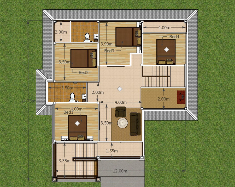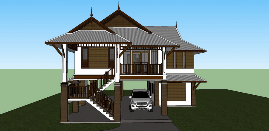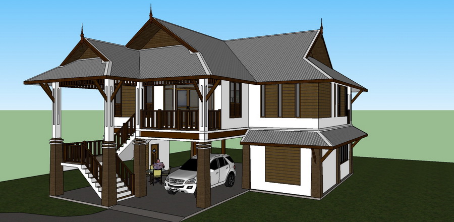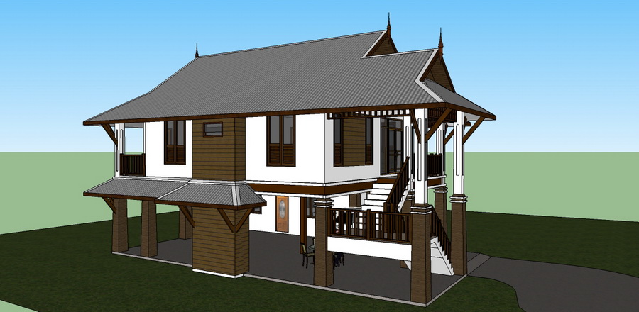 แบบบ้านใต้ถุนสูงทรงไทยประยุกต์หลังนี้ประกอบไปด้วย 4 ห้องนอน 3 ห้องน้ำ 1 ห้องรับแขก 1 ห้องครัว 1 ห้องทานข้าว มีระเบียงหน้าบ้าน ห้องพระ ห้องละหมาด ห้องเก็บของใต้บันได พื้นที่ใช้สอยประมาณ 160 ตารางเมตร งบก่อสร้างเริ่มต้นที่ประมาณ 1.7 ล้านบาท