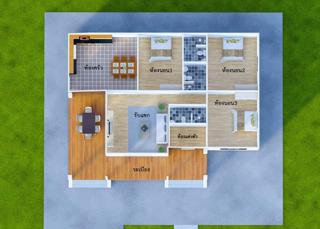 แบบบ้านชั้นเดียวหลังนี้ประกอบไปด้วย 3 ห้องนอน 3 ห้องน้ำ 1 ห้องครัว 1 ห้องโถงรับแขก บนพื้นที่ใช้สอย 167 ตารางเมตร งบประมาณก่อสร้างอยู่ที่ 1.99 ล้านบาทครับ