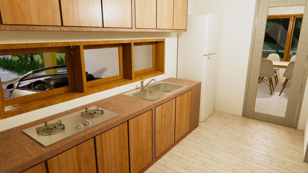 ห้องครัว อบอุ่นและน่าใช้งานด้วยเคาน์เตอร์ไม้และตู้แขวนไม้