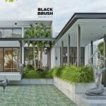 บริบทรอบตัวบ้านถูกออกแบบให้เป็นพื้นที่นอกชาน ปูพื้นด้วยบล็อกคอนกรีตสีเทา ในขณะที่พื้นที่รอบนอกชานเป็นสวนสีเขียวที่ช่วยเพิ่มความสดชื่นได้เป็นอย่างดี