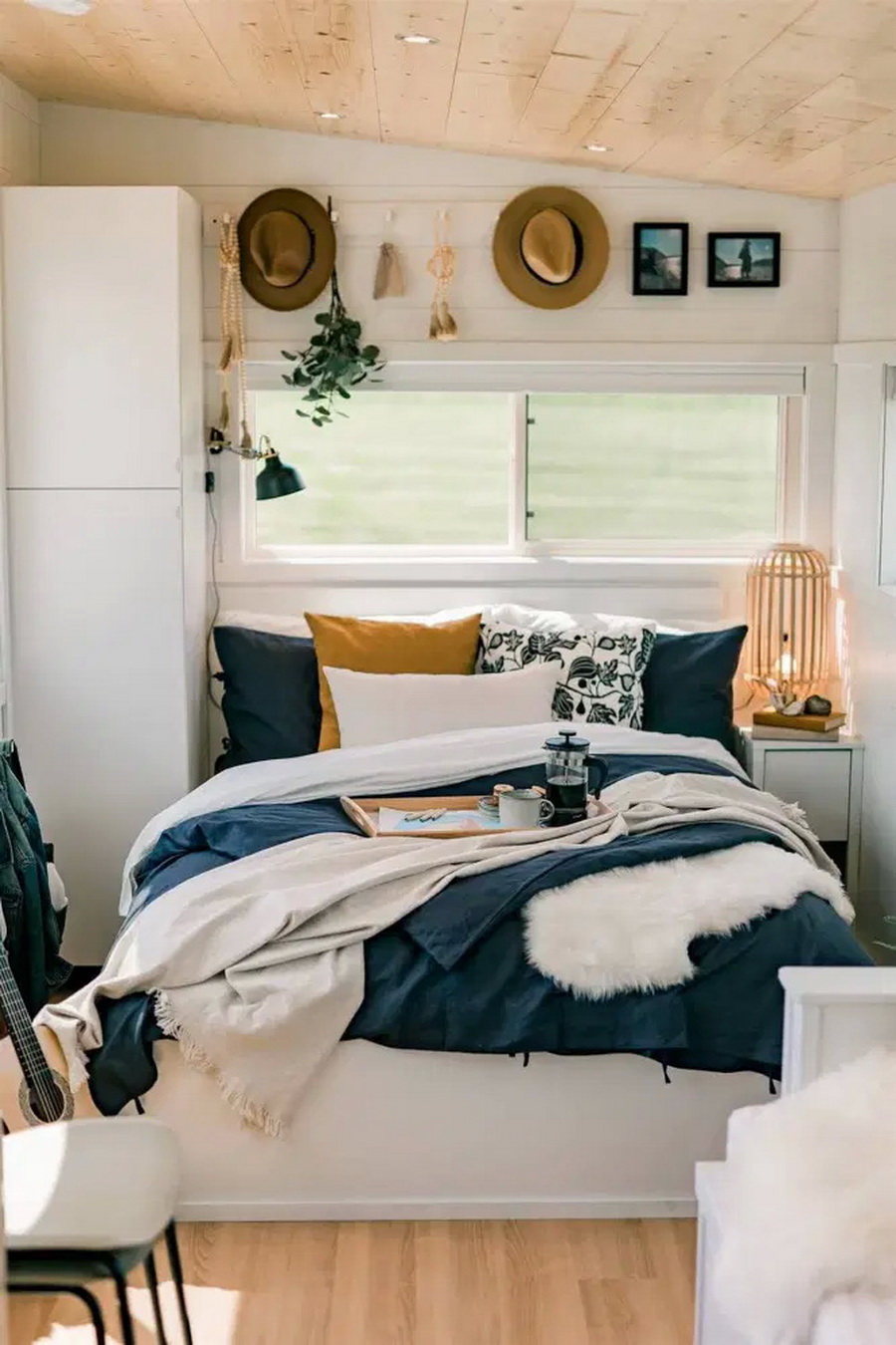 สำหรับมุมของที่นอนนั้น ถูกจัดวางด้วยเตียงตัวใหญ่ มีวิวสวย ๆ จากหน้าต่าง นอกจากนี้เราจะเห็นได้ว่ารถบ้านคันนี้ยังติดตั้งแอร์เอาไว้อีกด้วยนะ
