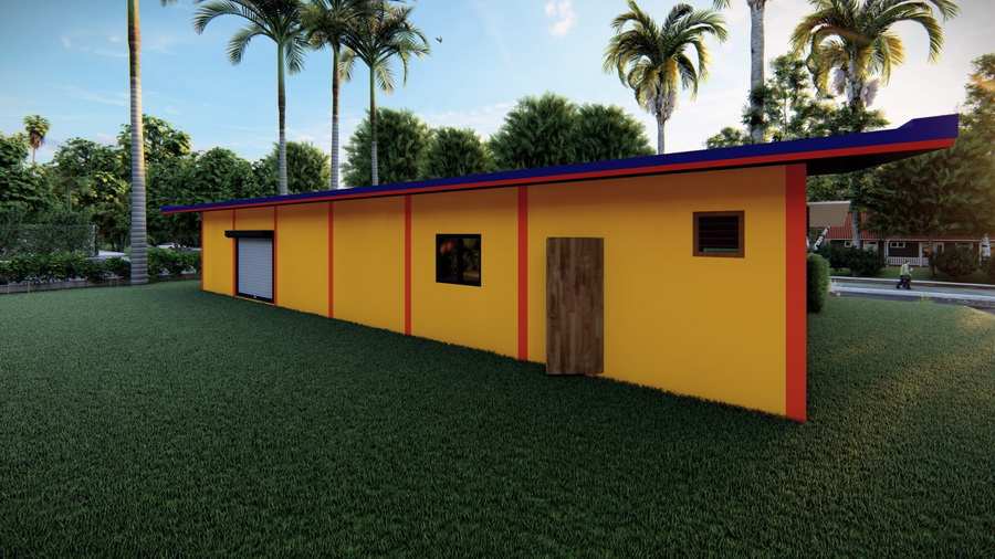 แบบบ้านค้าหลังนี้เป้นอาคารทรงโมเดิรืนที่ออกแบบเรียบงานในลักษณะทรงสี่เหลี่มแบบหน้ากว้าง มีหลังคาทรงเพิงหมาแหงนที่เข้ากันได้ดีกับตัวบ้าน ด้านการตกแต่งนั้น จะเลือกใช้โทนสีสดใสอย่างสีเหลือง น้ำตาลและส้ม เพื่อดึงดูดสายตา