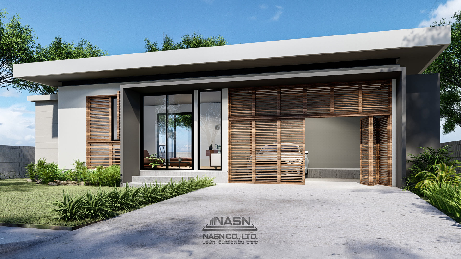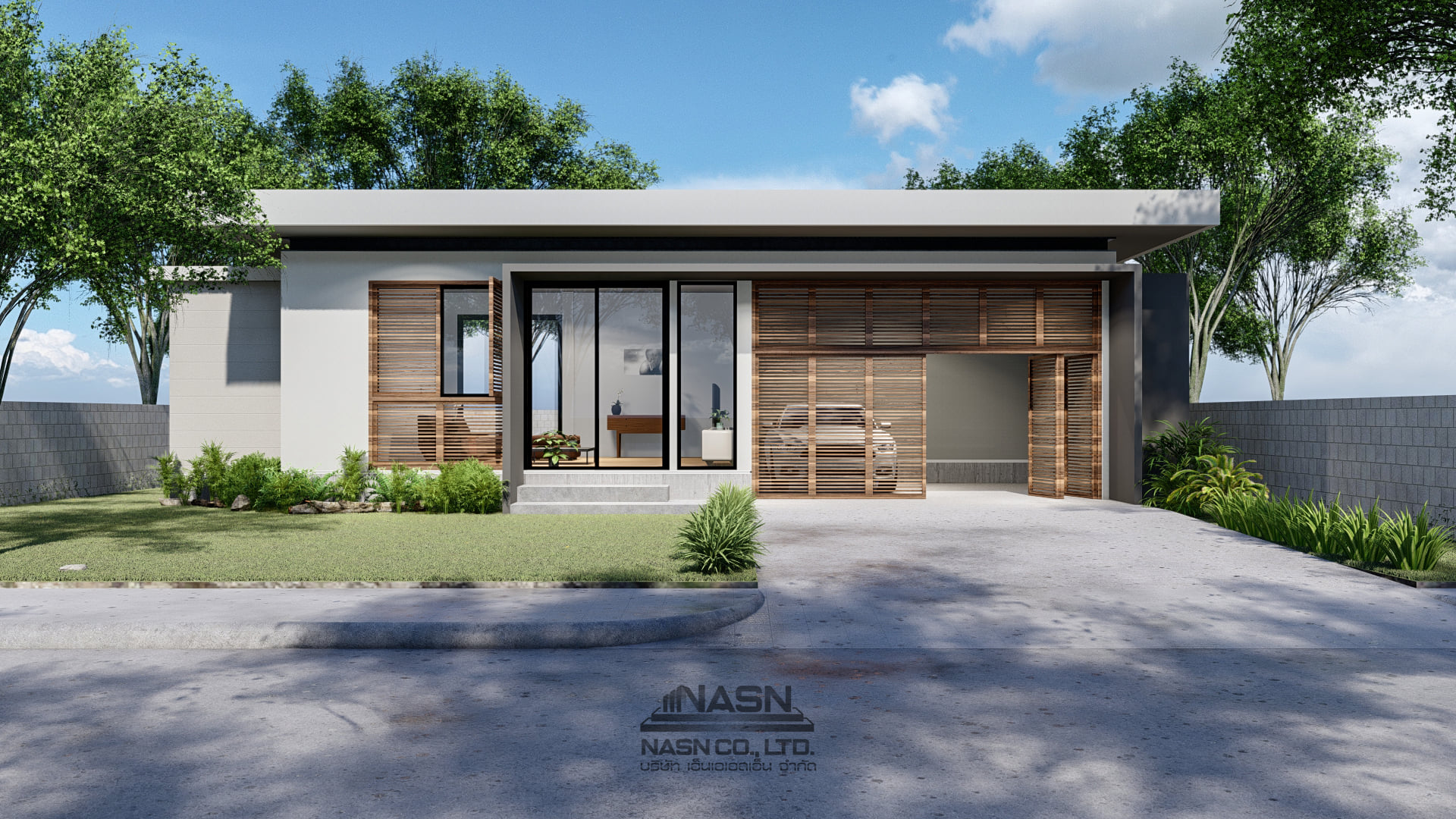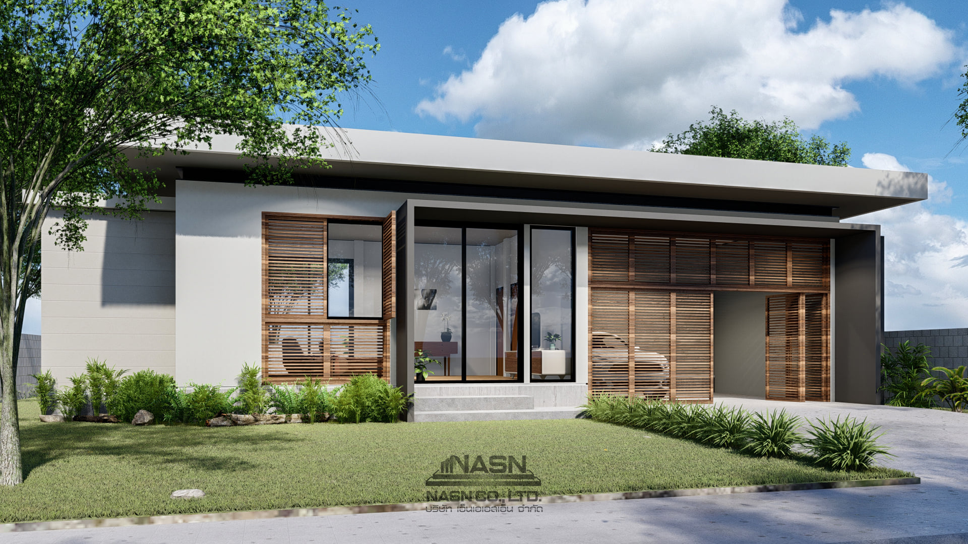 แบบบ้านหลังนี้เป็นชั้นเดียวที่ออกแบบลักษณะหน้ากว้าง ดีไซน์ในรูปทรงสี่เหลี่ยมพร้อมกับหลังคาแบบเรียบ ๆ ด้านการตกแต่งนั้น ผนังภายนอกตกแต่งด้วยโทนสีขาวครีมแบบสบายตา เพิ่มสีน้ำตาลจากระแนงไม้ รวมถึงสีดำจากกรอบประตูหน้าต่างที่เข้ากันอย่างลงตัว