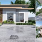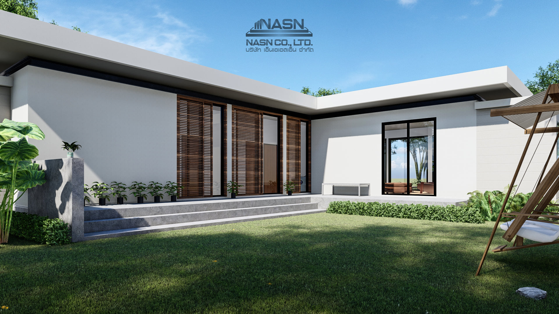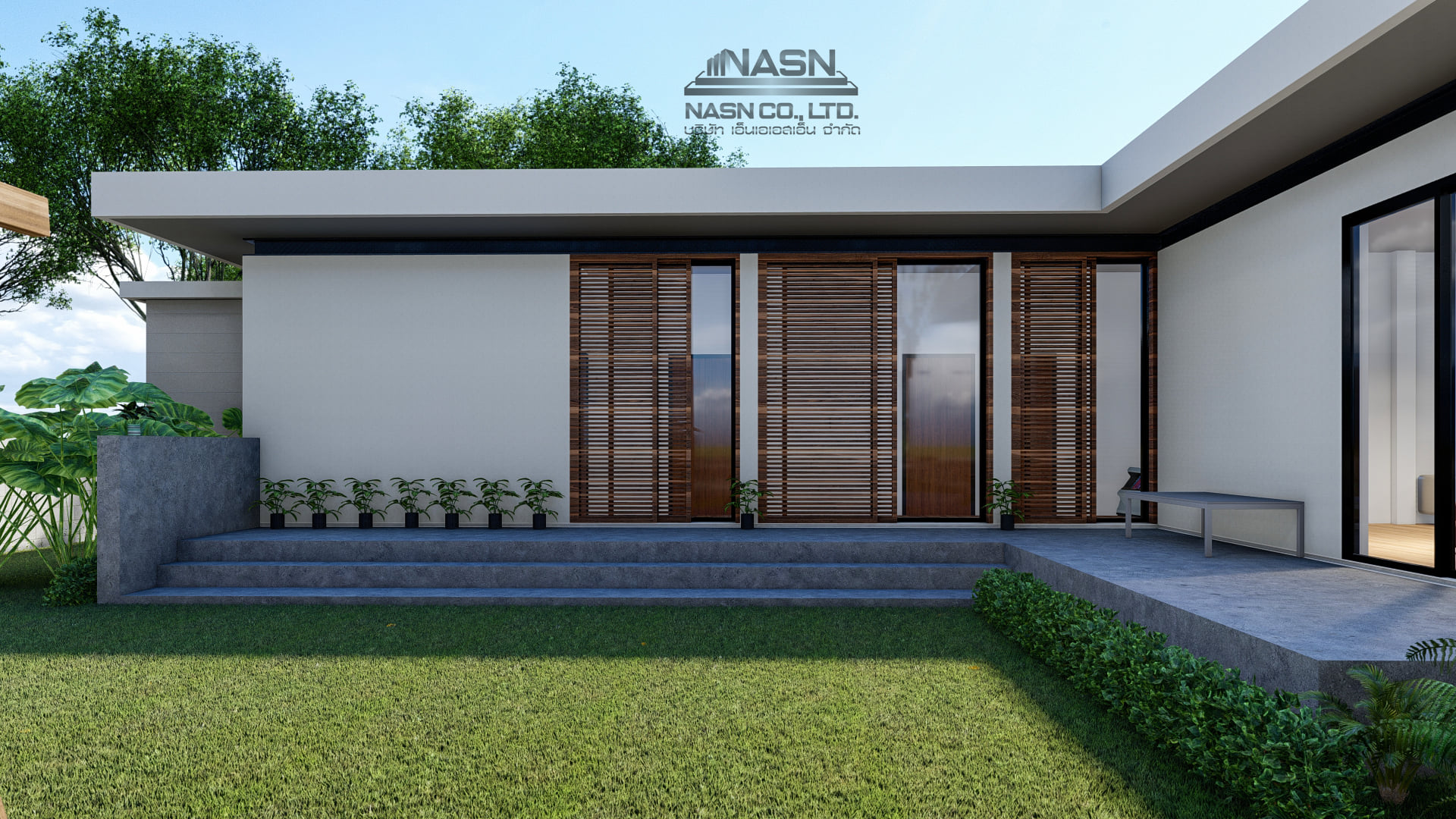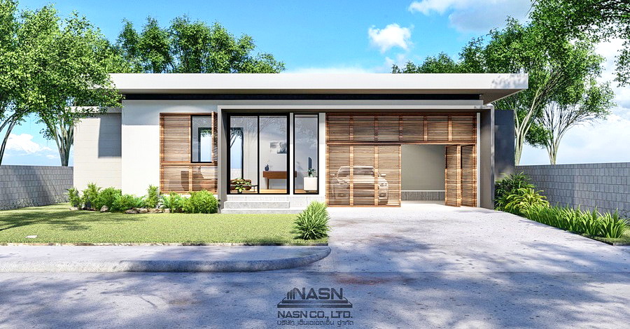 แบบบ้านหลังนี้เป็นชั้นเดียวที่ออกแบบลักษณะหน้ากว้าง ดีไซน์ในรูปทรงสี่เหลี่ยมพร้อมกับหลังคาแบบเรียบ ๆ ด้านการตกแต่งนั้น ผนังภายนอกตกแต่งด้วยโทนสีขาวครีมแบบสบายตา เพิ่มสีน้ำตาลจากระแนงไม้ รวมถึงสีดำจากกรอบประตูหน้าต่างที่เข้ากันอย่างลงตัว