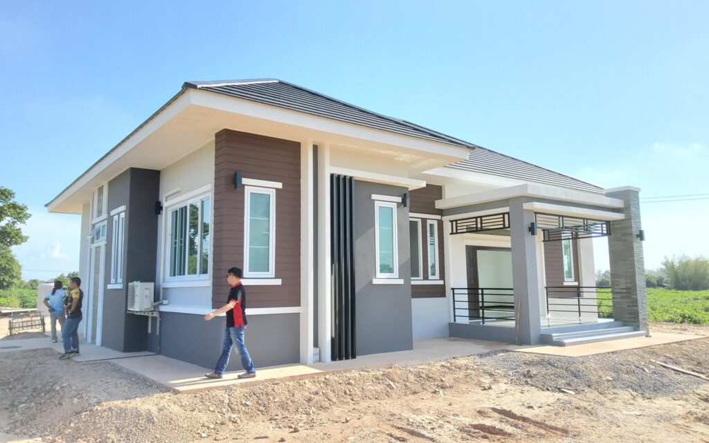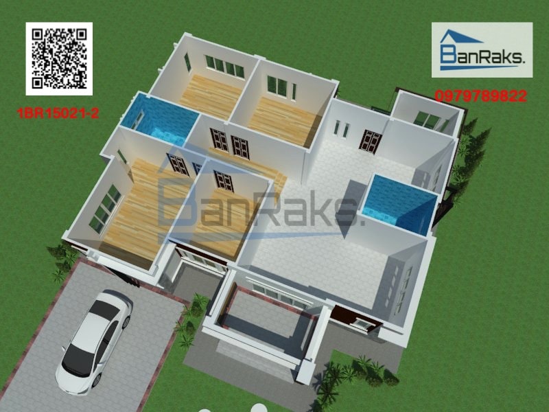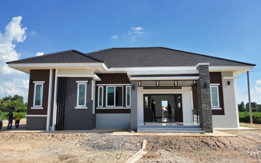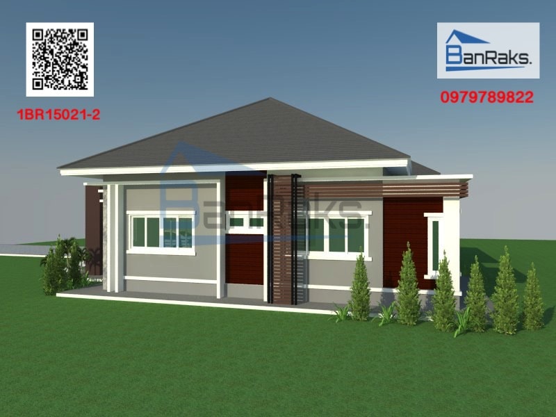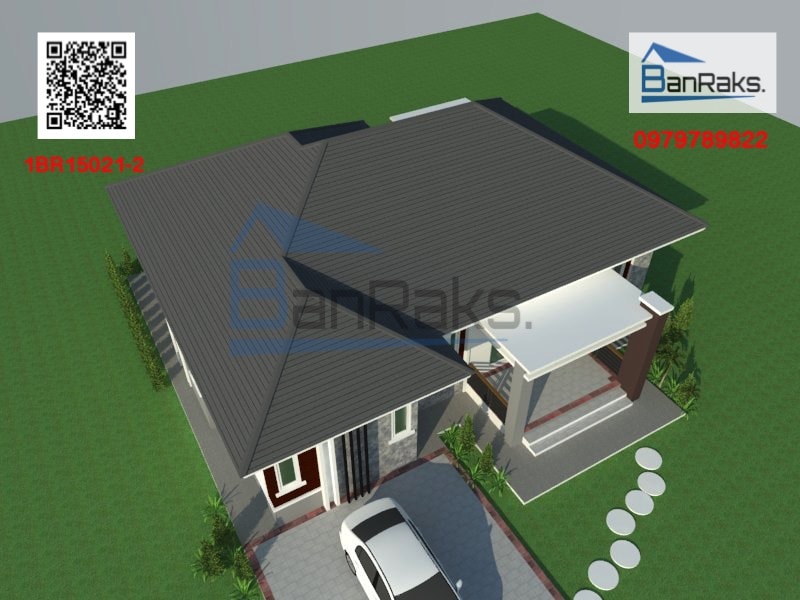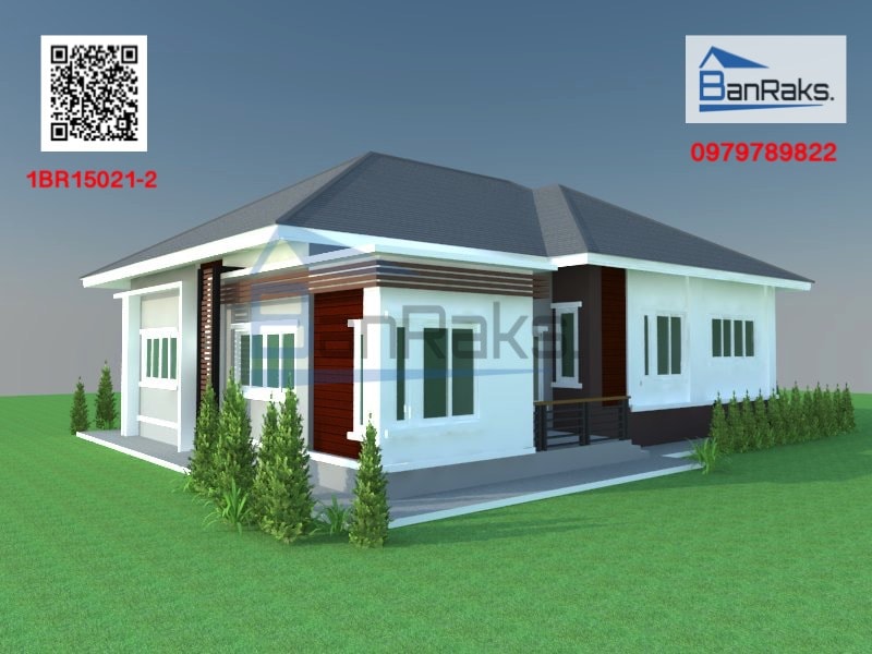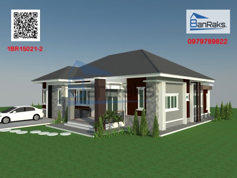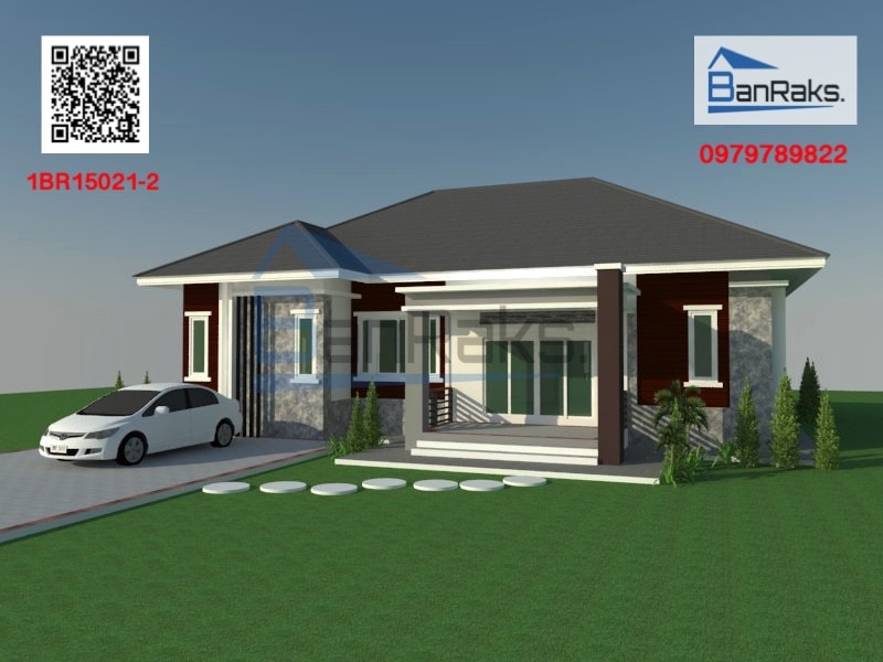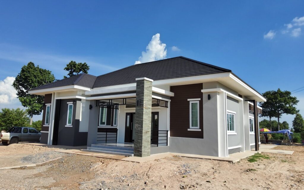 แบบบ้านชั้นเดียวสไตล์โมเดิร์นทรอปิคอล โทนสีเทาอมฟ้า 3 ห้องนอน 2 ห้องน้ำ พื้นที่ 175 ตร.ม.