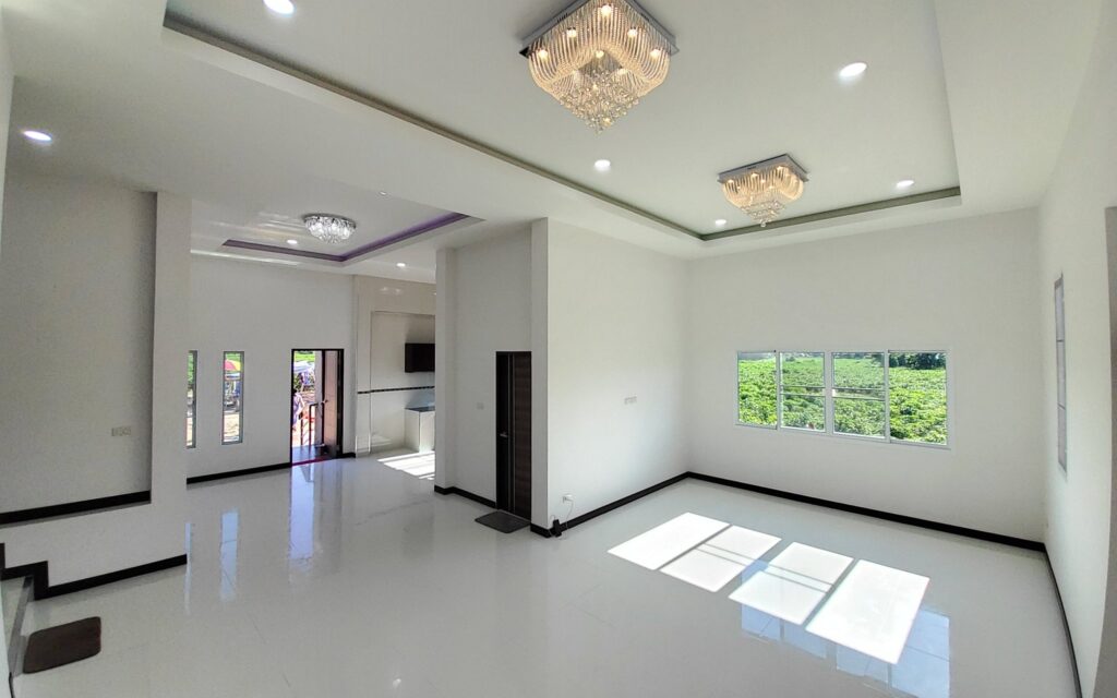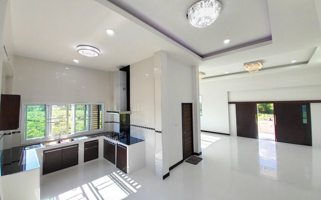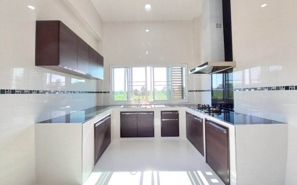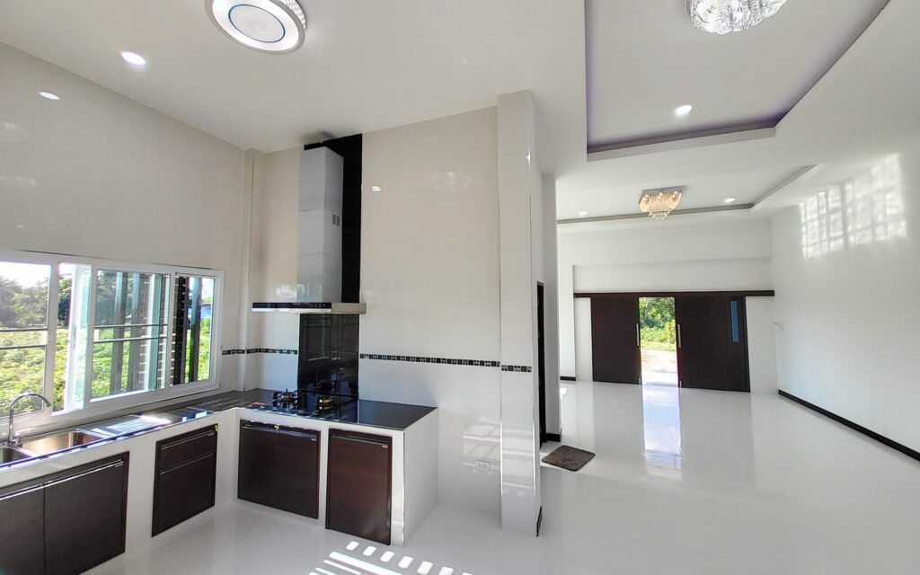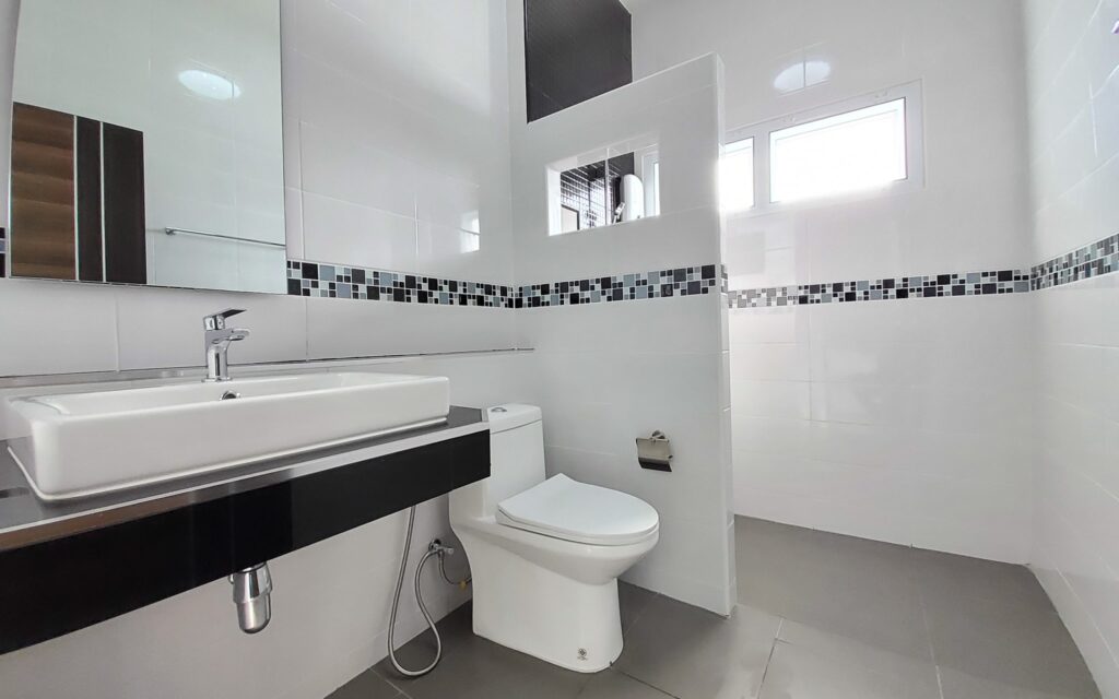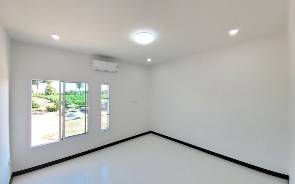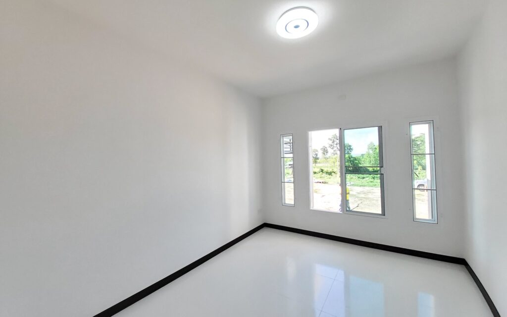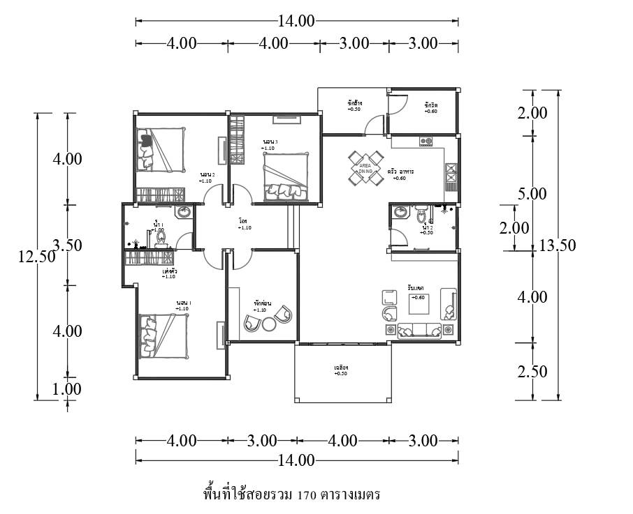 แบบบ้านชั้นเดียวสไตล์โมเดิร์นทรอปิคอล โทนสีเทาอมฟ้า 3 ห้องนอน 2 ห้องน้ำ พื้นที่ 175 ตร.ม.