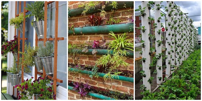มักจะใช้ผนังหรือกำแพง ที่ใช้วัสดุจากอิฐ ไม้ โครงเหล็ก และท่อ PVC เจาะรูปตั้งโครงให้ได้ตามต้องการ ใช้กระถางเป็นภาชนะรองรับผักเอาไว้ ที่เหลือก็เลี้ยงดูตามแบบฉบับของการปลูกผักสวนครัวทั่วไป แค่นี้ก็ประยุกต์ของเก่าให้ได้ประโยชน์ และสร้างพื้นที่ไม่ให้ไร้ค่าอีกต่อไป
