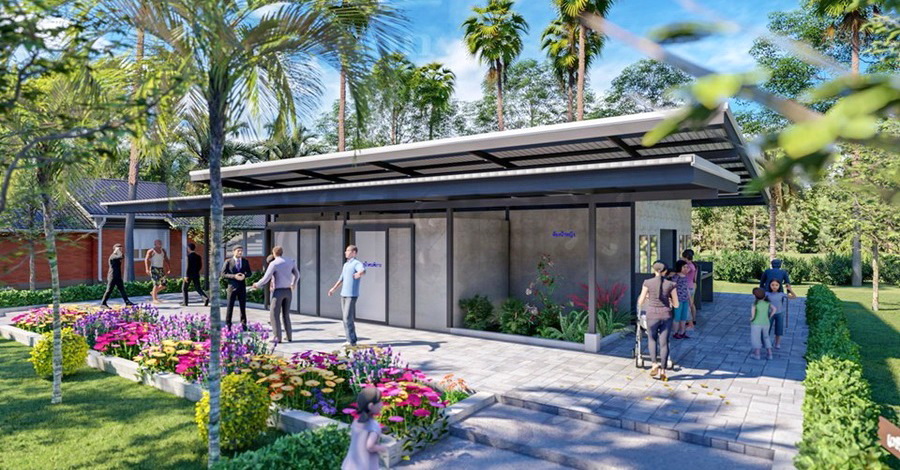 สำหรับห้องน้ำหลังนี้เป็นอาคารขนาดชั้นเดียว มีดีไซน์ที่เรียบง่ายแบบโมเดิร์น ตกแต่งด้วยหลังคารูปทรงเพิงหมาแหงน ผนังภายนอกตกแต่งด้วยผนังปูนเปลือยแบบสวยดิบ โดยห้องน้ำหลังนี้ถูกออกแบบให้ครอบคลุมทุกการใช้งานทั้งห้องน้ำชาย-หญิง และห้องน้ำคนพิการ