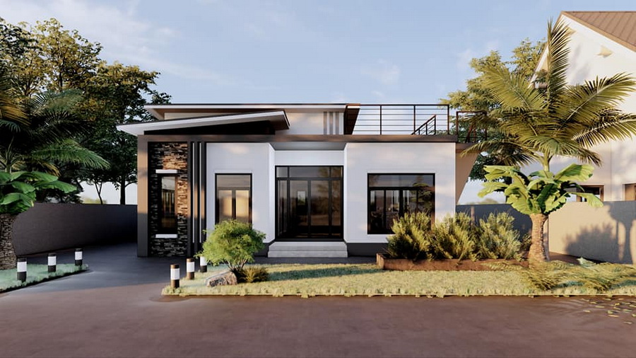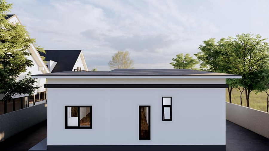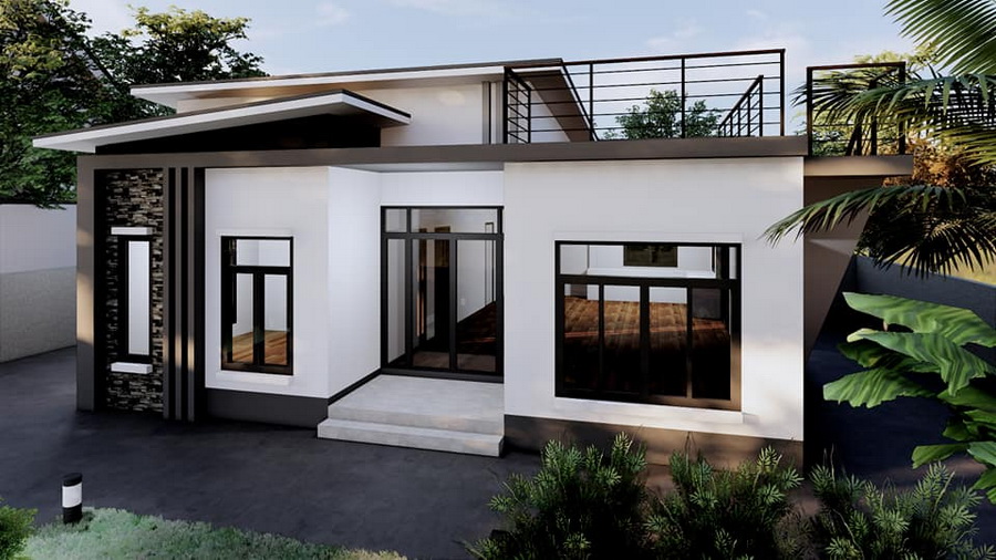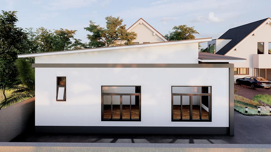 บ้านหลังนี้เป็นบ้านชั้นเดียวที่ออกแบบดีไซน์อย่างเรียบง่ายในสไตล์โมเดิร์น งานหลังคาบ้านออกแบบในลักษณะที่ลาดเอียง จึงเข้ากันดีกับตัวบ้าน ด้านการตกแต่งนั้น ผนังภายนอกเลือกใช้โทนสีขาวเป็นหลัก แซมด้วยโทนสีดำเพื่อเพิ่มความน่าสนใจให้บ้าน