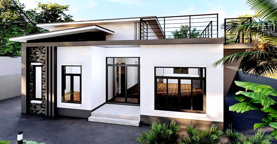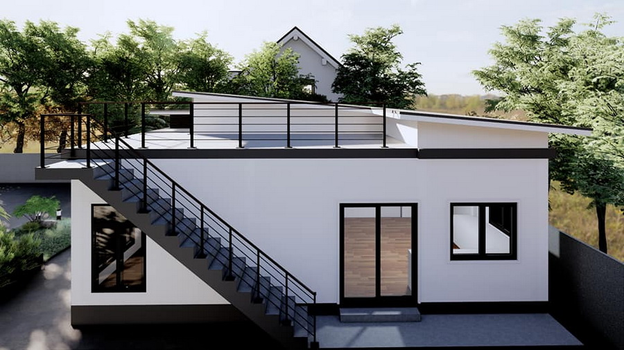 แบบบ้านสไตล์โมเดิร์นหลังนี้ประกอบไปด้วย 2 ห้องนอน 2 ห้องน้ำ 1 ห้องโถงนั่งเล่น 1 ห้องครัว พร้อมกับดาดฟ้าเพื่อการพักผ่อน พื้นที่ใช้สอยทั้งหมดประมาณ 180 ตารางเมตร