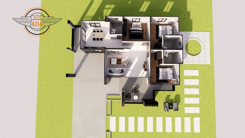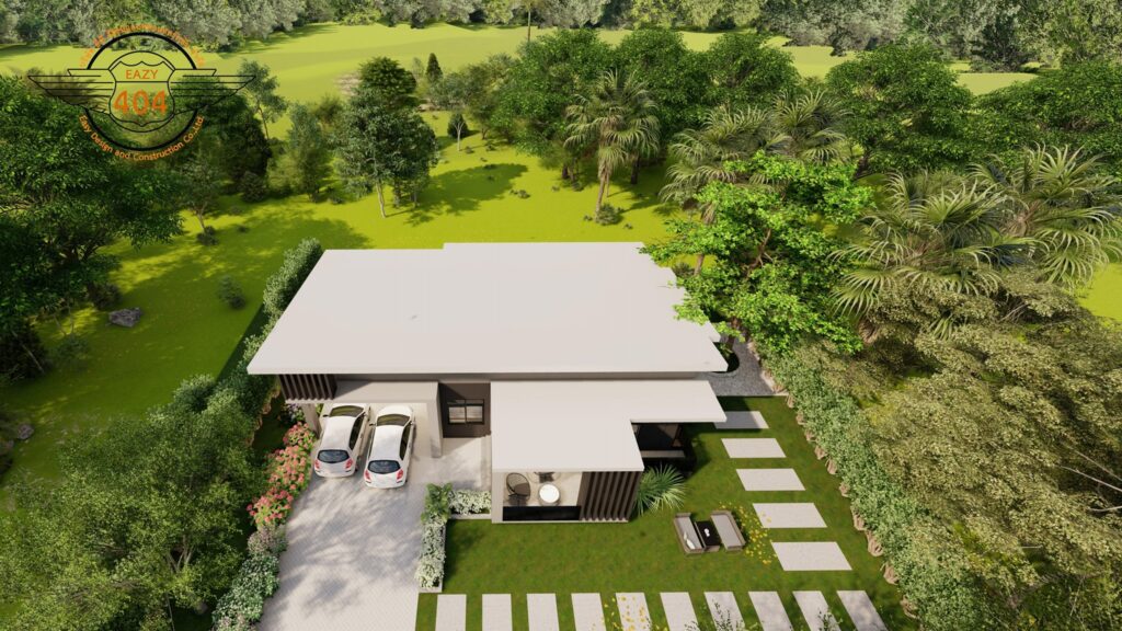มาชมวิวมุมสูงกันบ้าง ผู้ออกแบบได้จัดวางบริบทรอบบ้านให้เป็นแปลงที่ดินที่รายล้อมไปด้วยป่า ซึ่งโทนสีเขียวจากธรรมชาติก็เข้ากันได้ดีกับโทนสีของตัวบ้านครับ