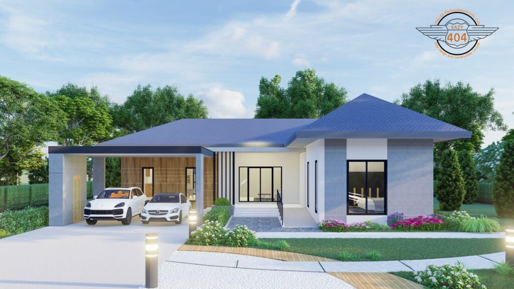 ลักษณะตัวบ้านชั้นเดียว ตกแต่งสไตล์โมเดิร์น รูปทรงตัวแอล หลังคาทรงปั้นหยามุงด้วยกระเบื้องโทนสีน้ำเงิน ผนังภายนอกตกแต่งด้วยโทนสีฟ้าอมเทายืนพื้น มีรายละเอียดของผนังลายไม้เล็กน้อยตรงผนังด้านซ้าย แทรกไปด้วยสีดำของระแนงเหล็กและวงกบประตูหน้าต่าง
