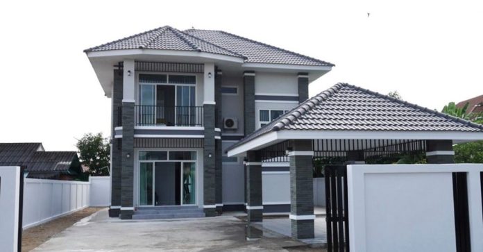 บ้านหลังนี้เป็น บ้านคอนเทมโพรารี หลังคาทรงปั้นหยาสีเข้ม เพิ่มลูกเล่นด้วยการปูกระเบื้อง ให้มีลักษณะคล้ายกับพีระมิด ตัวบ้านตกแต่งด้วยโทนสีเทา มีระแนงเหล็กเป็นดีเทล ดูเรียบหรู ภูมิฐาน บ่งบอกสไตล์ของเจ้าของบ้าน