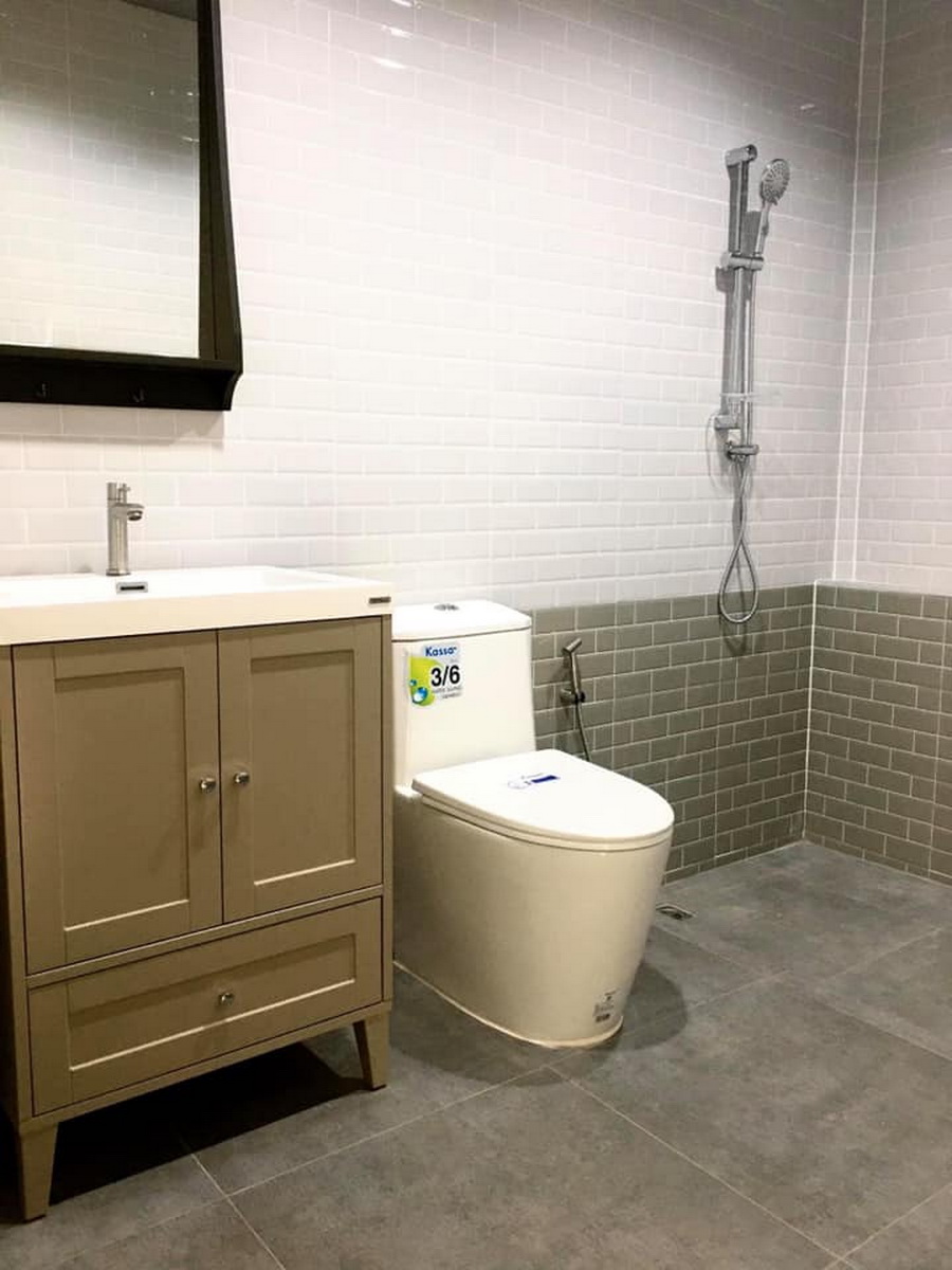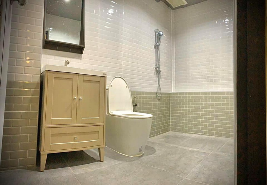 เช่นเดียวกันกับห้องน้ำที่ภายในมีพื้นที่กว้าง ผนังห้องตกแต่งด้วยกระเบื้องโมเสกโทนสีอ่อน พร้อมกับมีชุดสุขภัณฑ์ที่ครบทุกการใช้งาน
