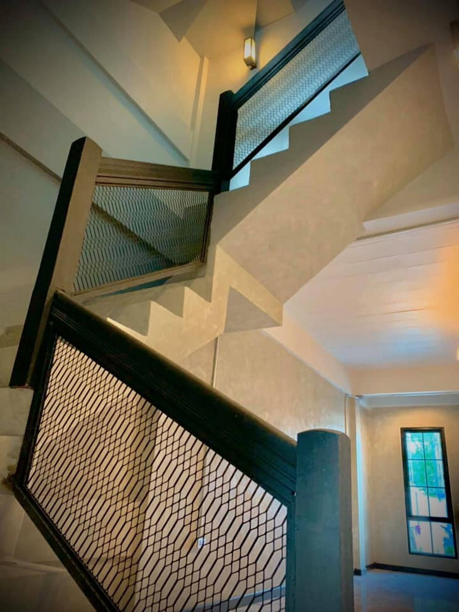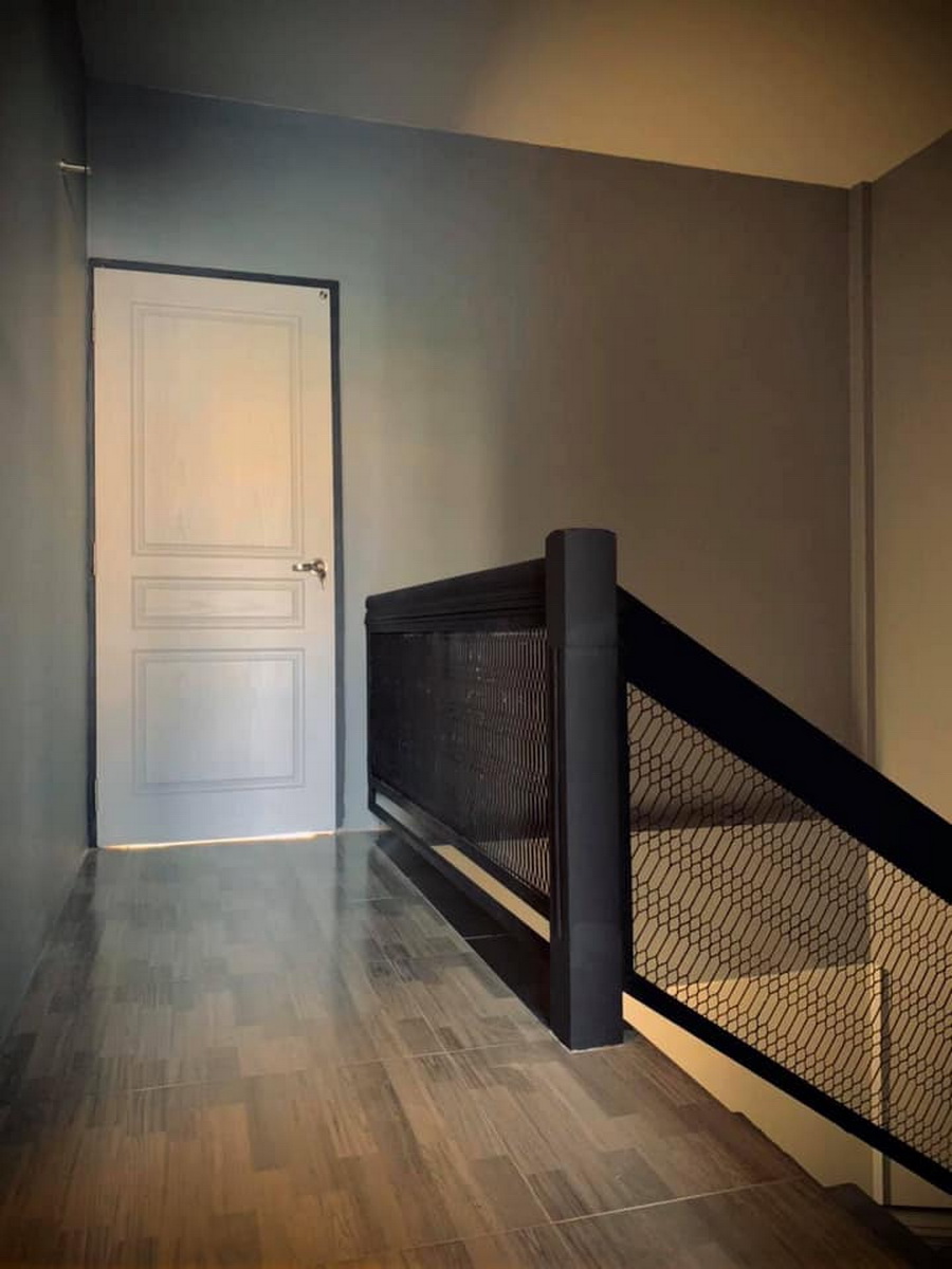 บันไดที่เชื่อมต่อกับชั้น 2 และ ชั้น 3 ของบ้านถูกตกแต่งราวบันไดด้วยราวกันเหล็กที่มีดีไซน์แบบอินดัสเทรียลลอฟท์ จึงเป็นอีกมุมที่ให้บรรยากาศที่สวยเข้ม