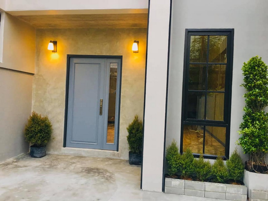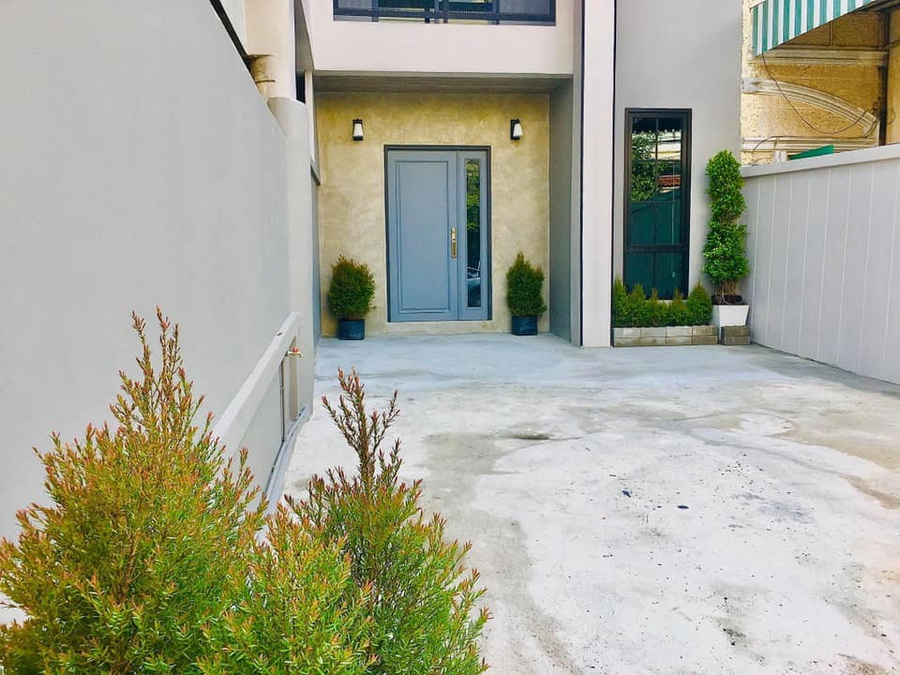 พื้นที่นอกบ้านที่กว้างขวาง สามารถแบ่งพื้นที่ในการตกแต่งเปฌนสวนสวยเล็ก ๆ ได้เป็นอย่างดี นอกจากนี้ อีกหนึ่งความโดดเด่น คือ การออกแบบประตูทางเข้าด้วยดีไซน์แบบยุโรปในโทนสีออกเทา