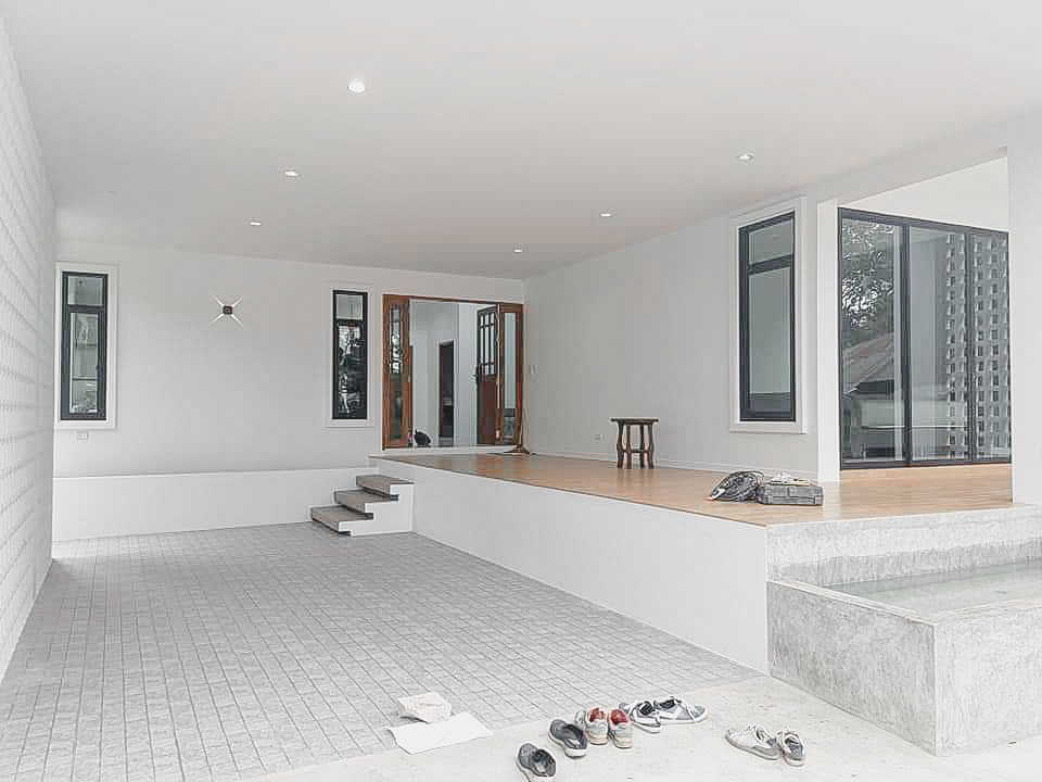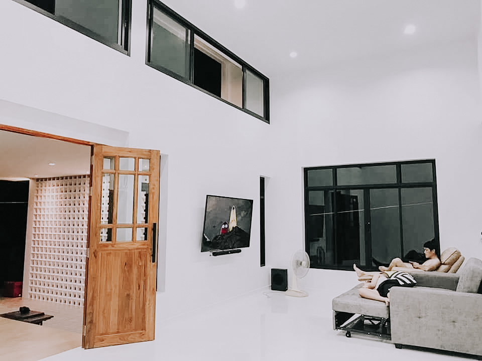 ภายในบ้านถูกออกแบบให้เป้นลักษณะของห้องโถงขนาดใหญ่แบบเพดานยกขึ้นสูง จึงมีความโปร่งสบาย บ้านจึงเย็นได้ตลอดวัน ทั้งยังสามารถแบ่งเป็นมุมต่าง ๆ ได้หลายมุม